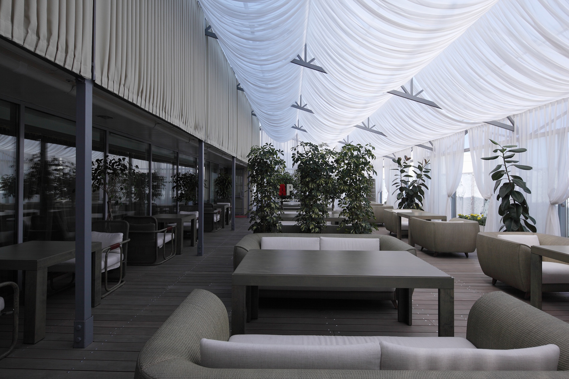 Из основного зала ресторана через стеклянные двери можно попасть на открытую террасу. Она расположена на крыше торгового центра и окружена стеклянными перегородками.