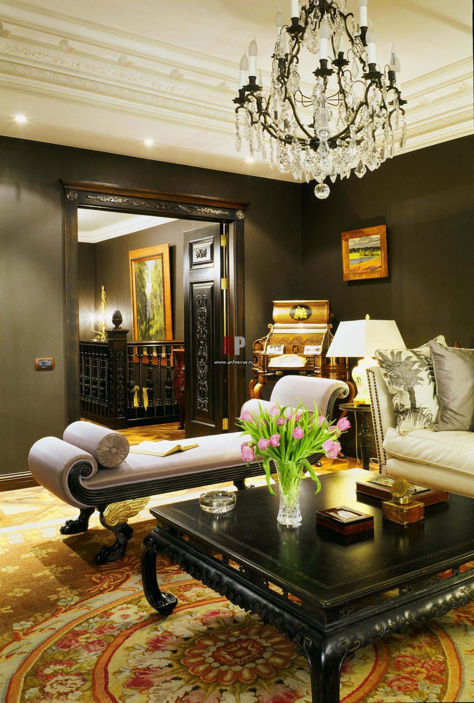 Гостиная в классическом стиле. Все помещения в доме оформлены сложными авторскими покрытиями с эффектом патины и состаренного золота. Двери, порталы, плинтуса выполнены по эскизам декоратора. Особое внимание декоратор уделяет финишной отделке авторских деревянных изделий из редких сортов дерева, они созданы по классической технологии XVIII – XIX веков.