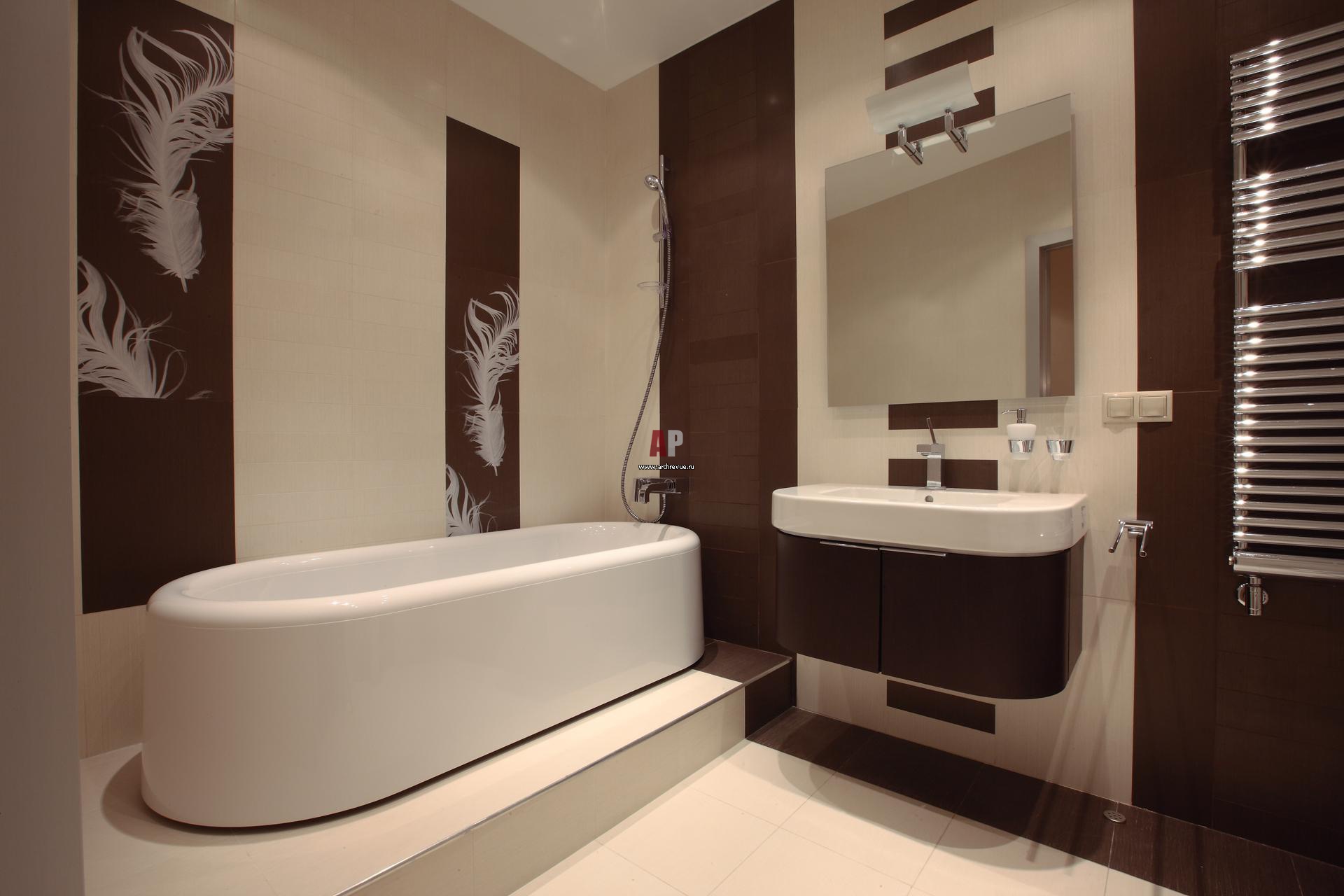 Ванная решена на контрасте бежевого и шоколадного цветов. Сантехнику, поставщик Konzept, отличает лаконичный дизайн и выразительная пластика.