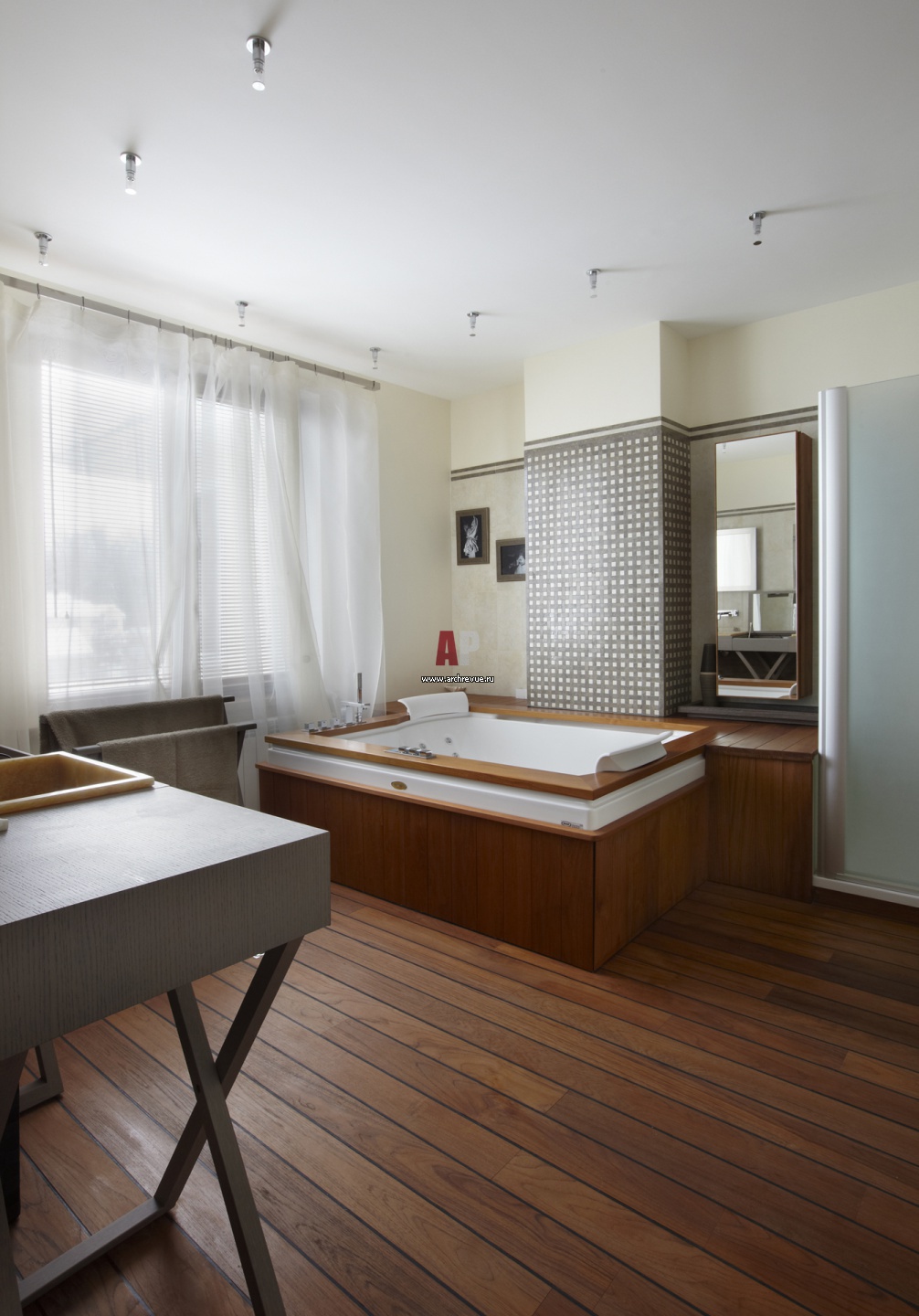 Хозяйская ванная в современном стиле. На полу – палубная доска из тика. Ванная с гидромассажем встроена в подиум.
