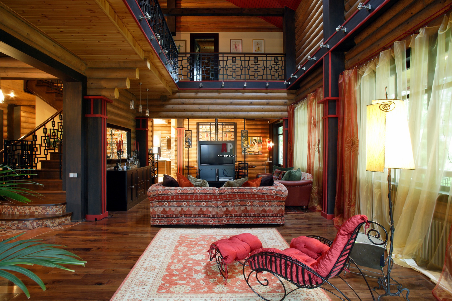 Бревенчатые стены объединенной гостевой зоны оттонированы в насыщенный ореховый цвет. Поставщик красочных составов, компания «Дом Краски / Деко – Эм». На полу – пестрая массивная доска из древесины ореха.