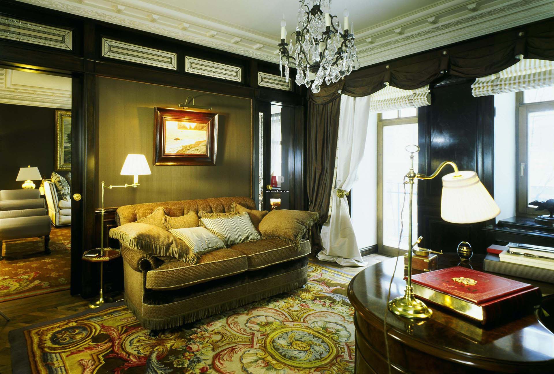 Зона отдыха в кабинете. Особого шарма и исторической правдоподобности интерьерам добавляют антикварные предметы и великолепные французские ковры ручной работы начала XIX века.