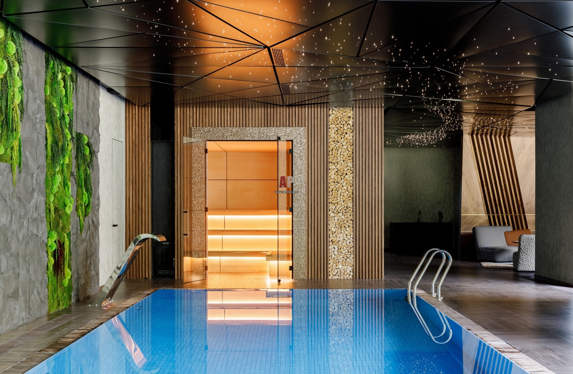К бассейну примыкает сауна, а также хаммам и душевые. Парная отделана абаши. Печь, Kastor. Серый камень в отделке стены – талькомагнезит.