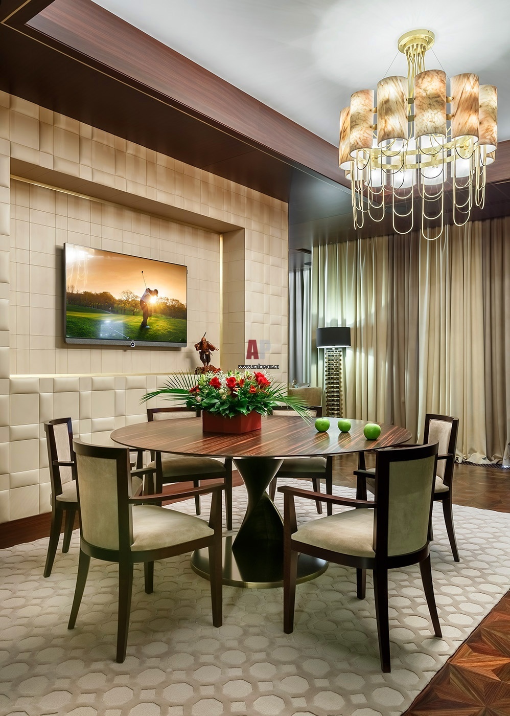 Стена в зоне столовой отделана кожаными панелями с выпуклым геометрическим рисунком, ТВ-экран утоплен в нишу. Стол, Rugiano. Стулья, JNL. Люстра с отделкой из шпона мрамора, Ginger & Jagger.
