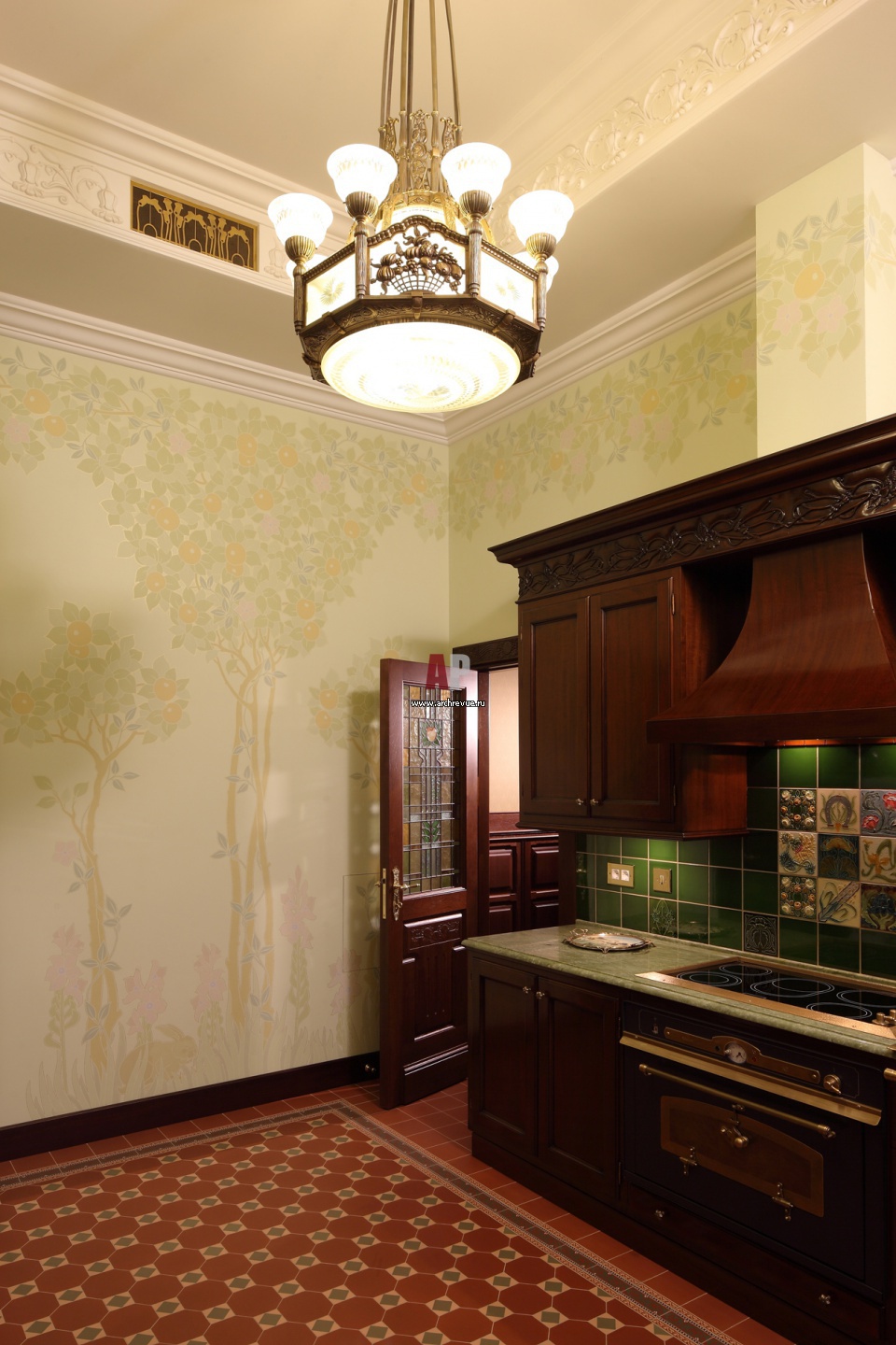 Декоративный акцент кухни – настенная роспись. Все в квартире – от дверных ручек и петель до вентиляционных решеток выполнено в стиле модерн.