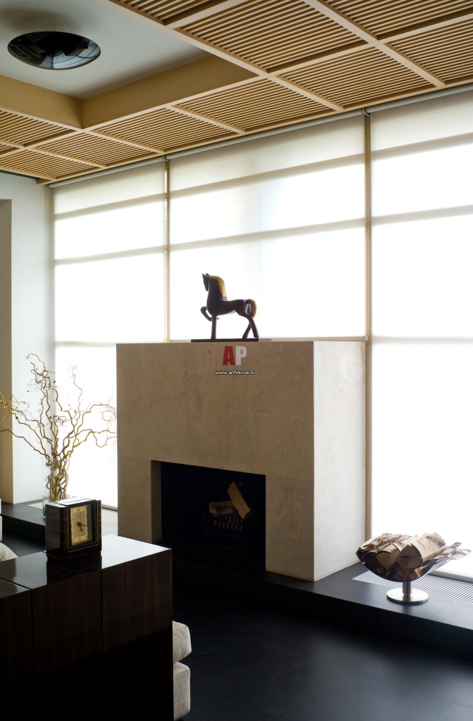 Каминный зал. Диван Flexform. Полоток зашит панелями из лиственницы, изготовление Tudor. Светильник выполнен на заказ по эскизам архитекторов.