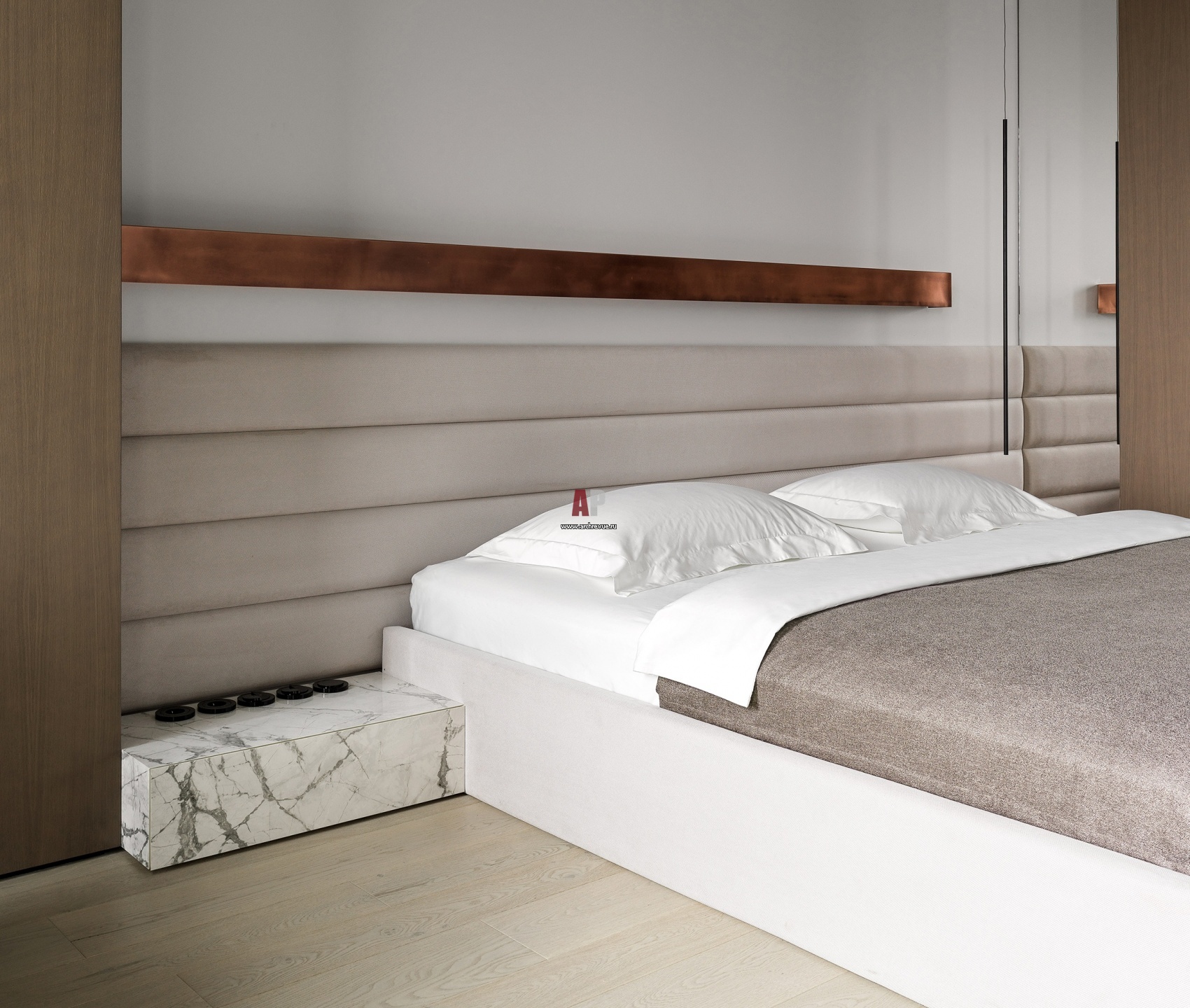Монохромная квартира с отделкой из меди