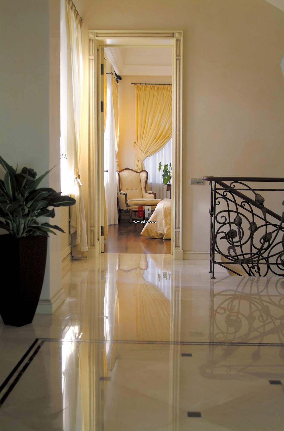 Фрагмент интерьера лестничного холла третьего этажа. На полах – светлый мрамор, поставщик Stone Craft.