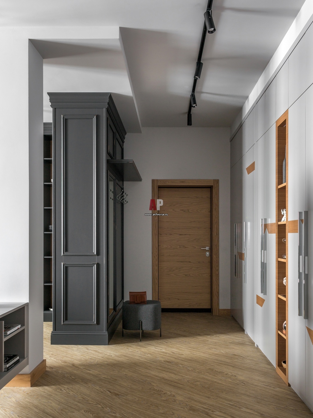Небольшую прихожую и коридор архитектор объединил в просторный холл, перетекающий в опен-спейс гостиной. Встроенный шкаф сделан на заказ. Его закрытые фасады комбинируются с открытыми деревянными полками, дополненными подсветкой.