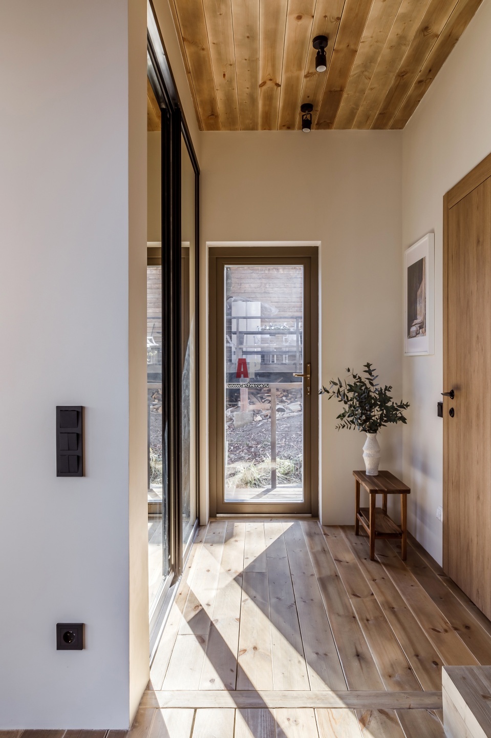 Входная дверь изготовлена из прозрачного стекла и хорошо пропускает естественный свет. Встроенный шкаф служит перегородкой, которая отделяет кухню от прихожей. Зеркальные двери визуально увеличивают небольшой, всего 2 кв. м, холл.