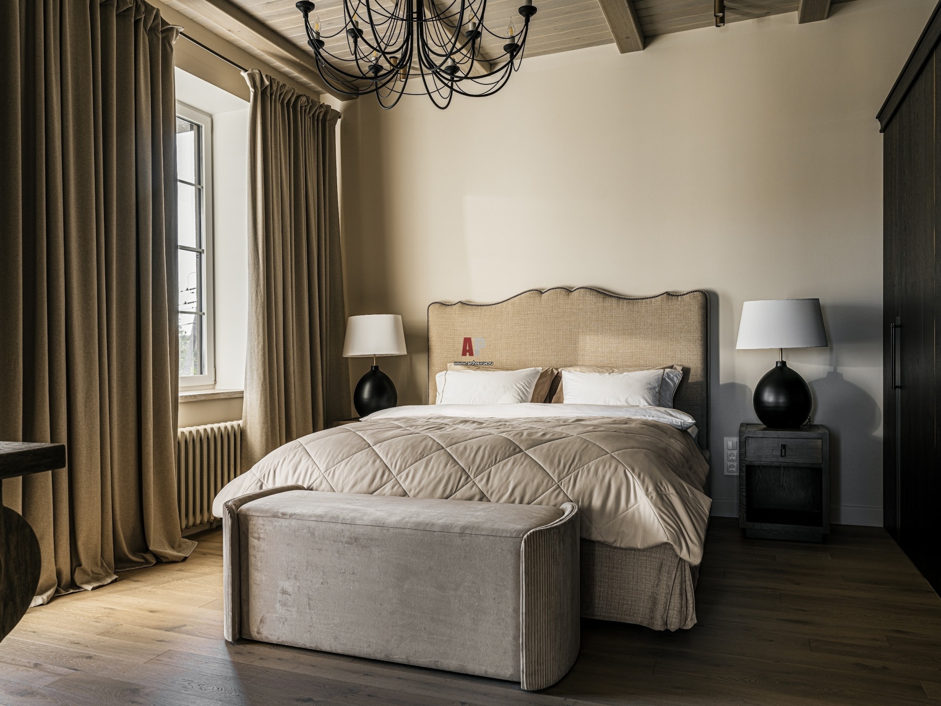 Потолочные фальш-балки в спальне на втором этаже создают прованский колорит.