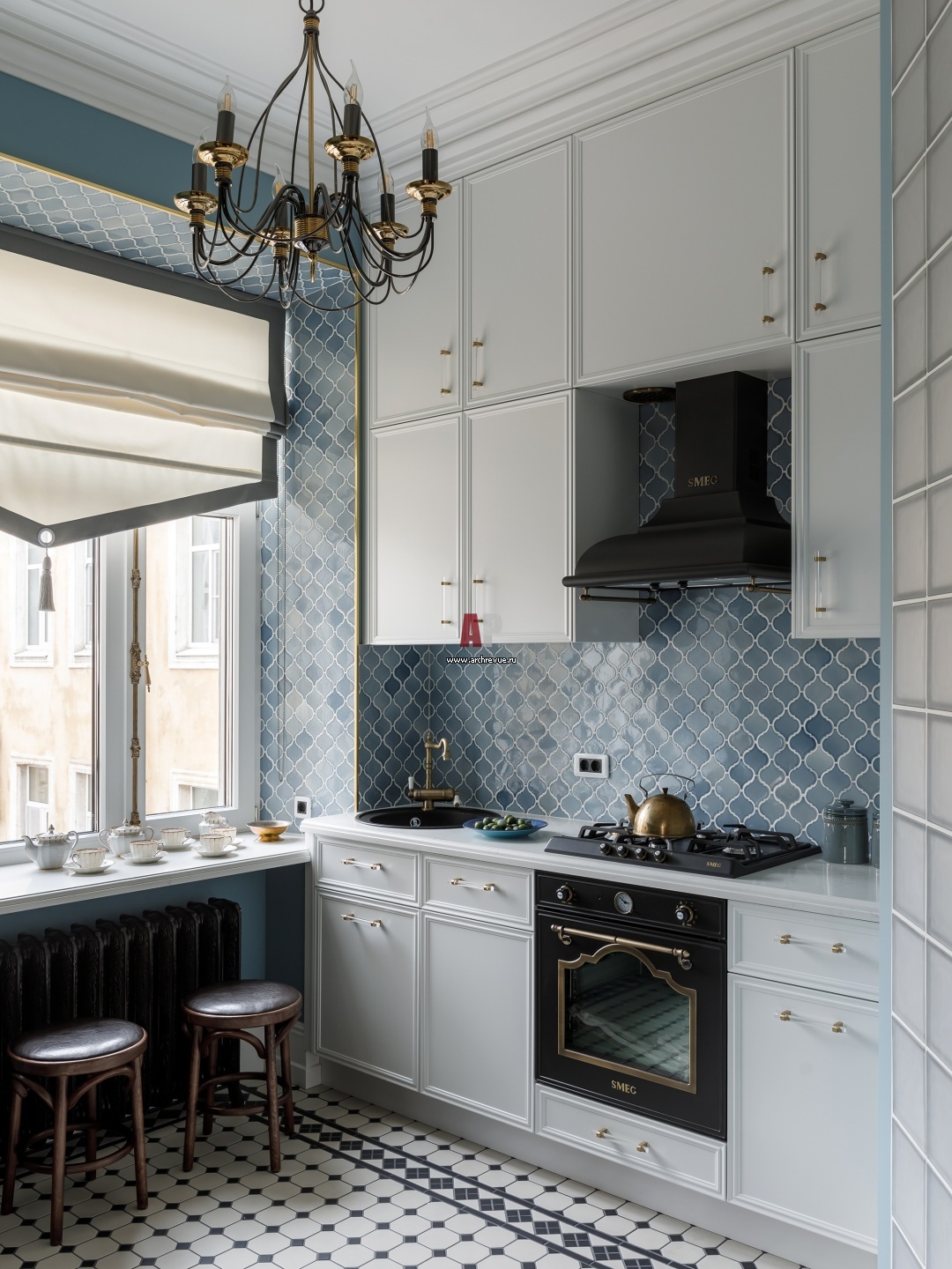 Кухня имеет неправильную форму. Кухонный гарнитур максимально легкий, но при этом функциональный, выполнен по эскизам дизайнера. Подоконник выполняет функцию барной стойки для быстрых завтраков у окна.