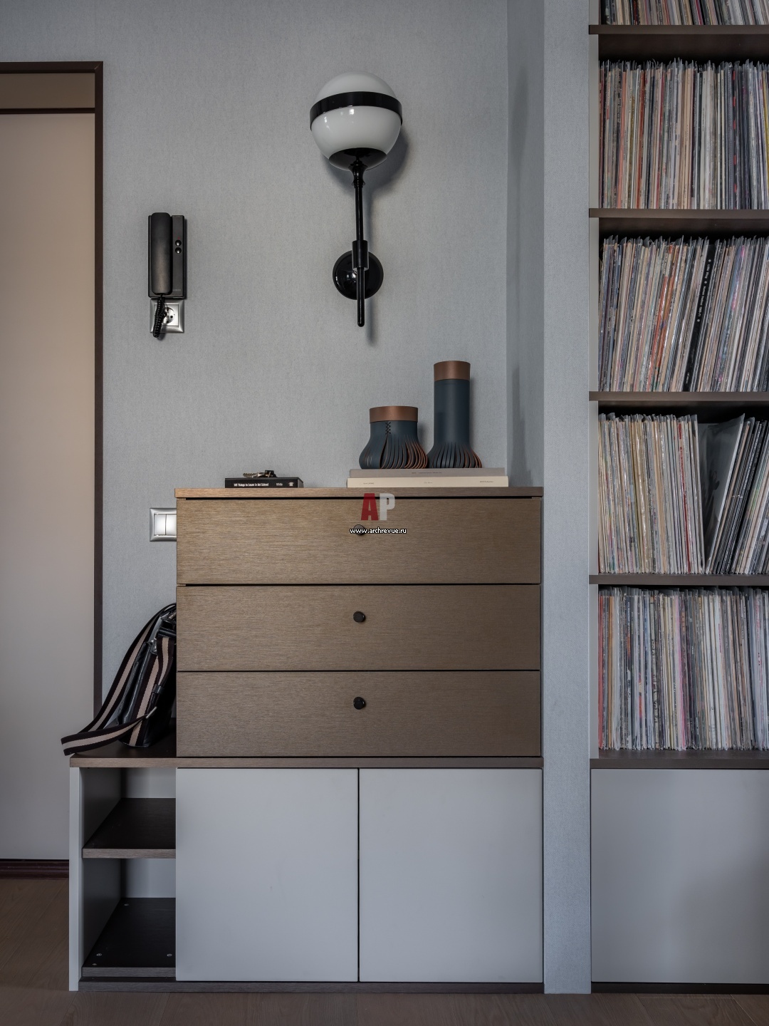 Стеллаж для хранения виниловых пластинок и тумба в прихожей сделаны на заказ. Ручки-кнопки, Buster + Punch, поставщик EMPORIO.ru.