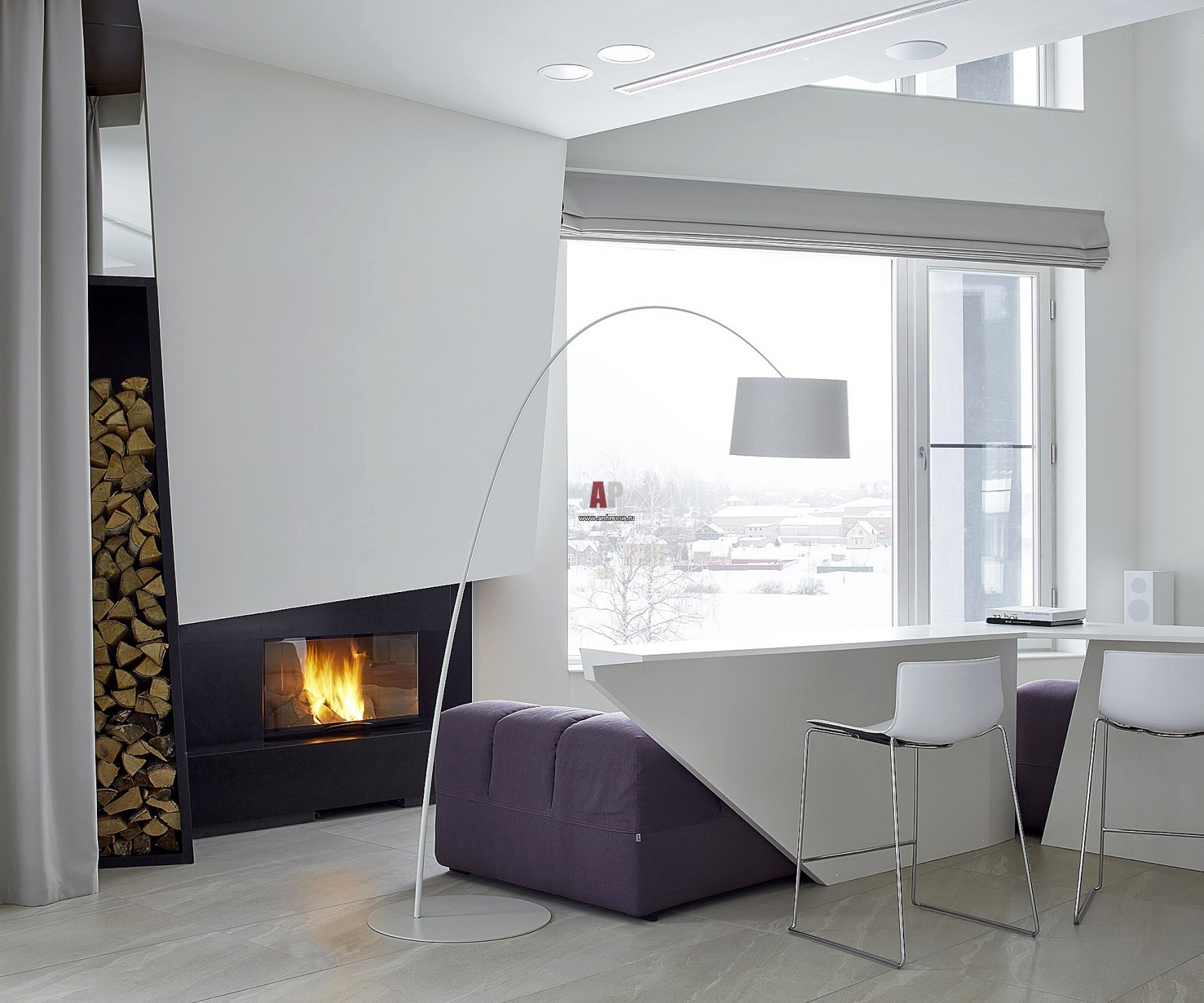 Интерьер гостиной с камином. Дровница, топка, дымоход выполнены как единый объем. Основной материал: металл, выкрашенный огнеупорной краской в белый цвет.