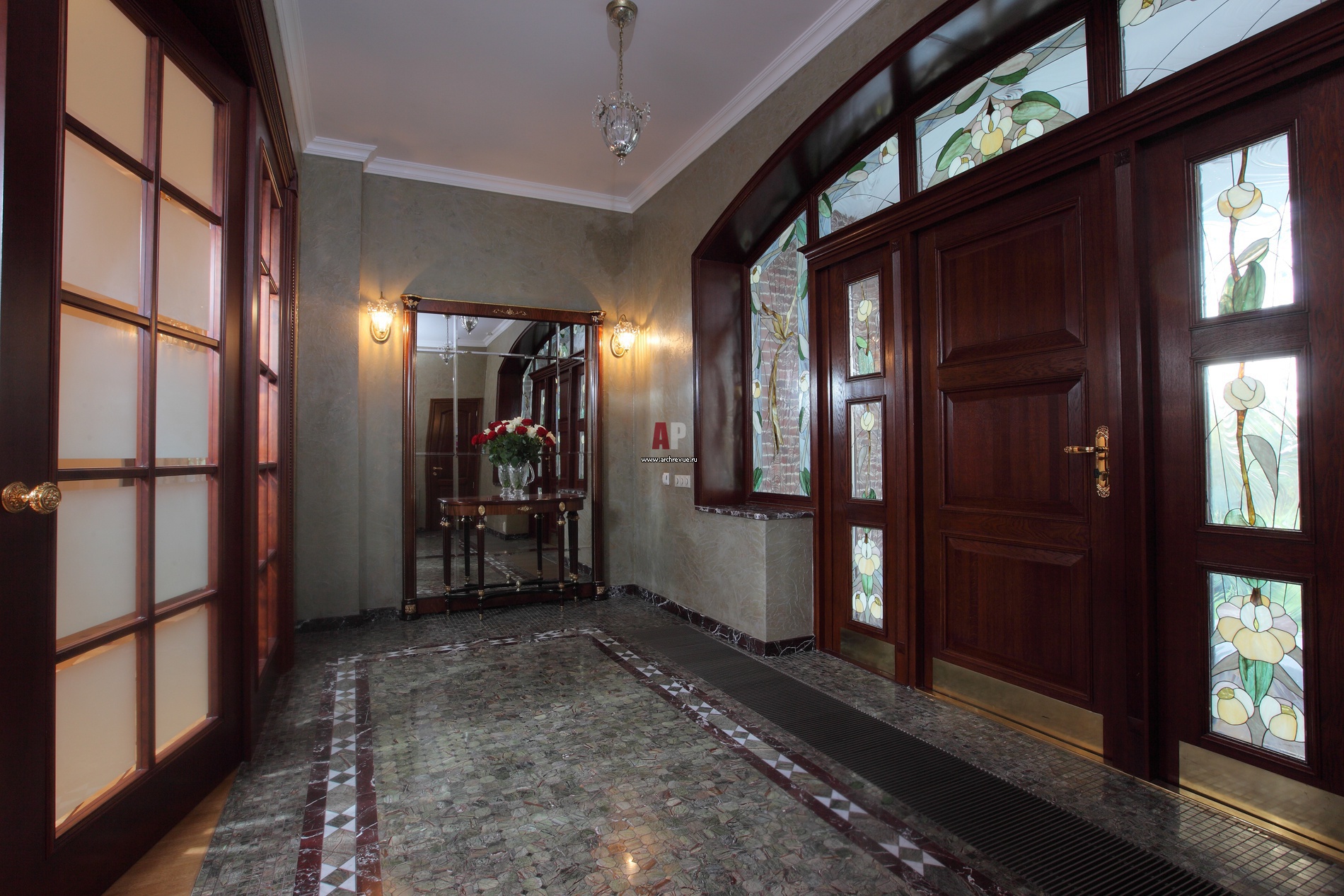 Вход в дом предваряет небольшая прихожая. Она выглядит торжественно благодаря витражам, мозаике Sicis и дверям из красного дерева. Они изготовлены на заказ компанией Mobile Line Décor.