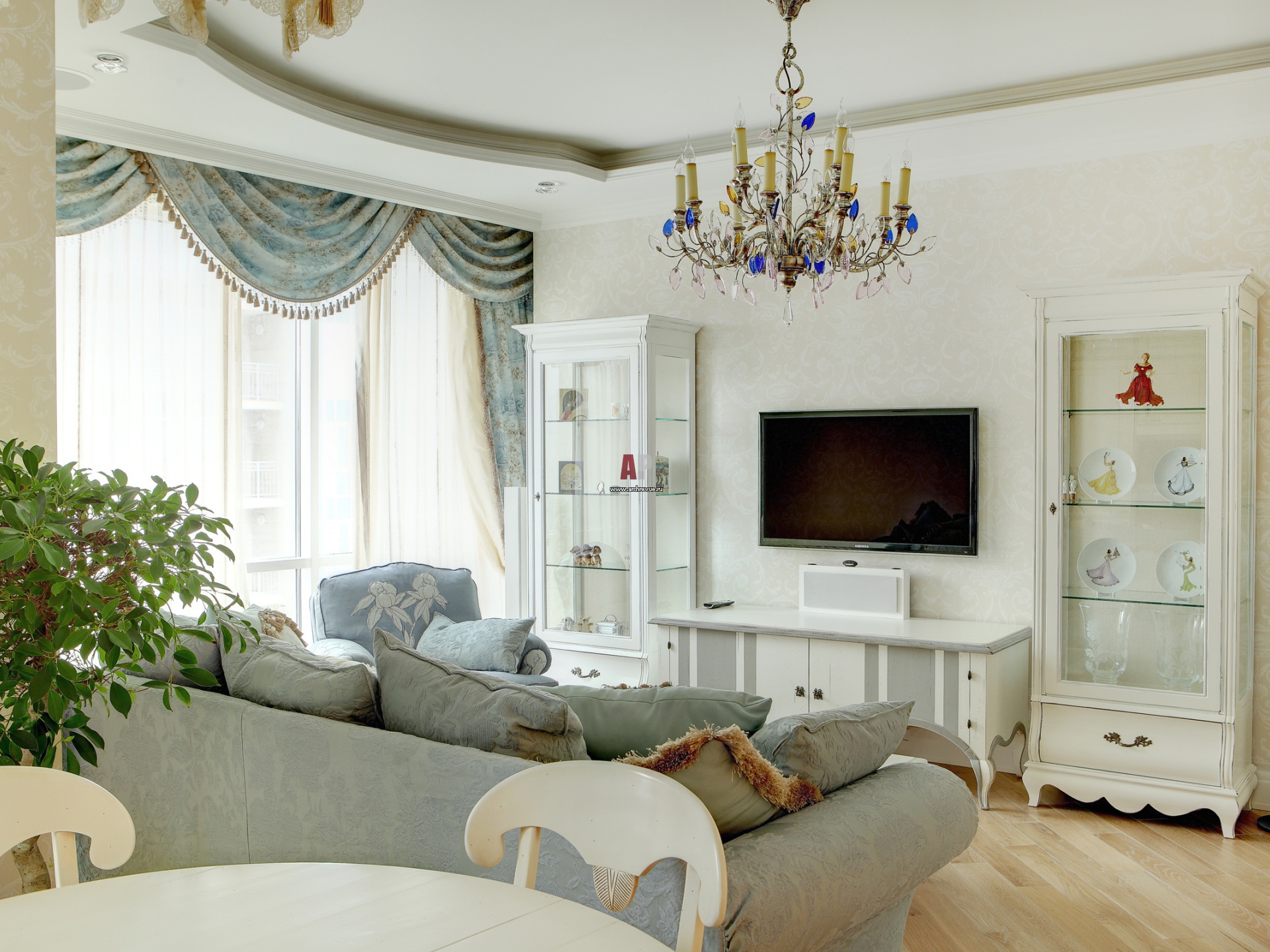 С цветовой палитрой штор перекликается обивка дивана, оформление люстр и декор посуды, выставленной в неоклассических буфетах. Ткани, поставщик «Галерея Арбен». Мебель Roche Bobois. Свет, поставщик «Светильники на Ордынке 39».