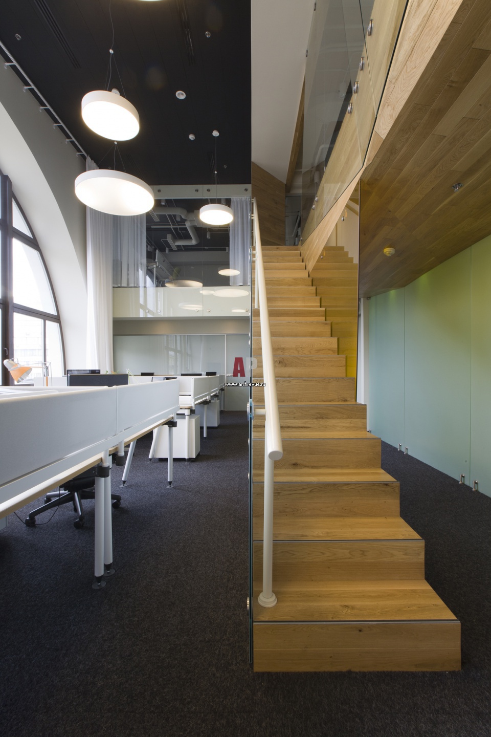 Ступени взмывающей вверх лестницы облицованы светлым деревом. Авторы проекта Петр Зайцев, Арсений Борисенко, архитектурное бюро za bor.