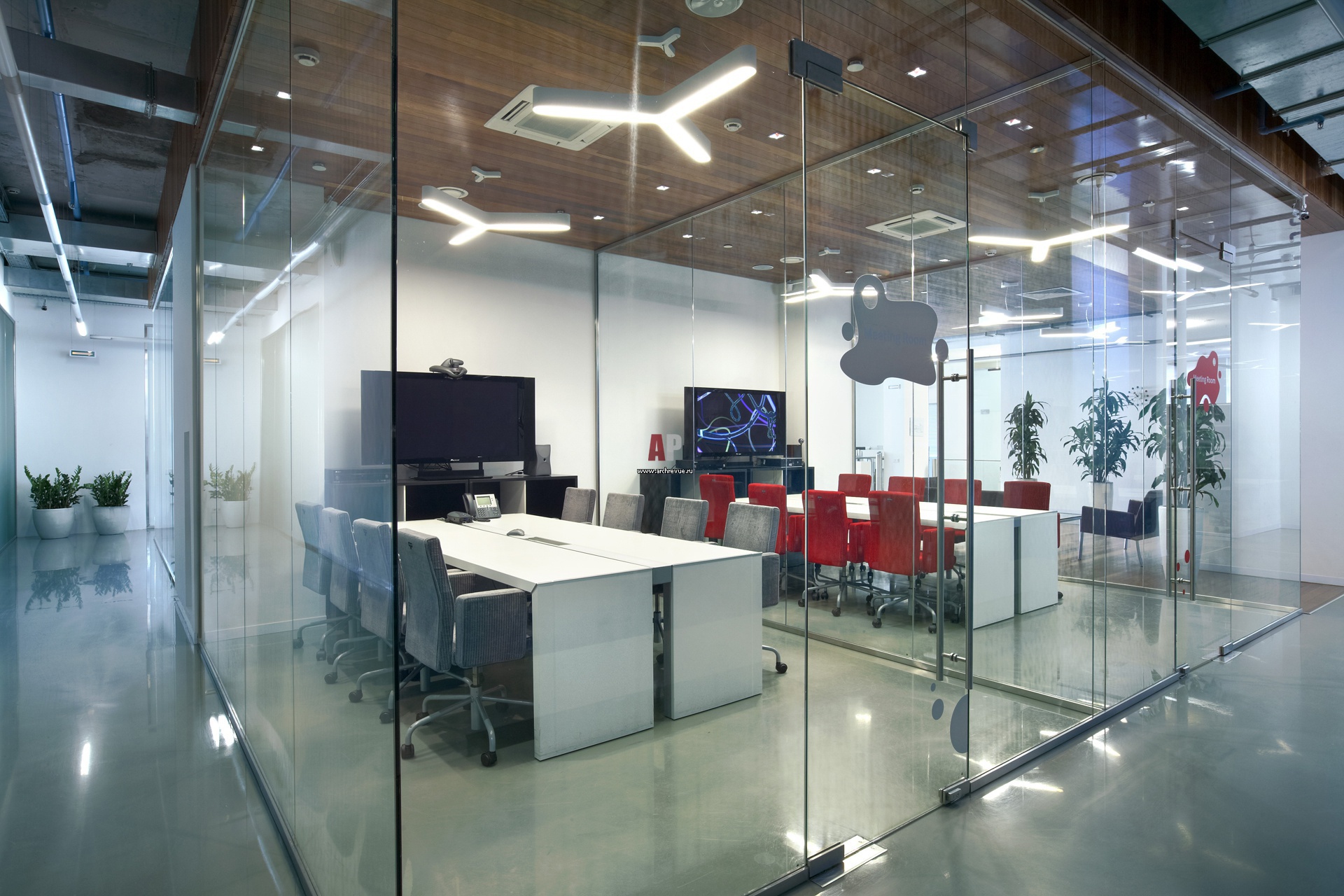 Четыре переговорные спроектированы общими блоками по две. Друг от друга и от рабочего пространства они отделены стеклянными перегородками Dorma .
