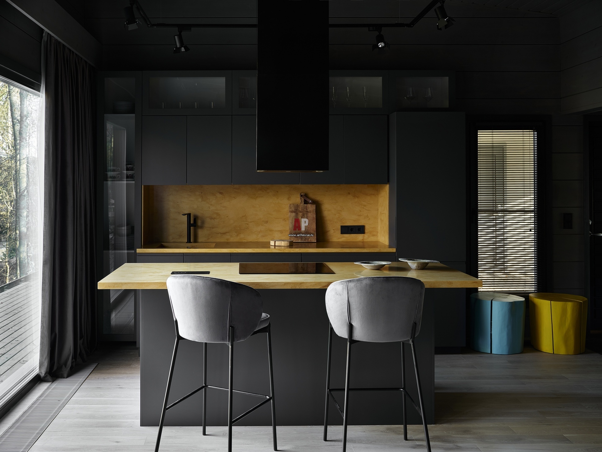Кухня с островом изготовлена на заказ. За счет темно-графитовых фасадов она выглядит брутально.