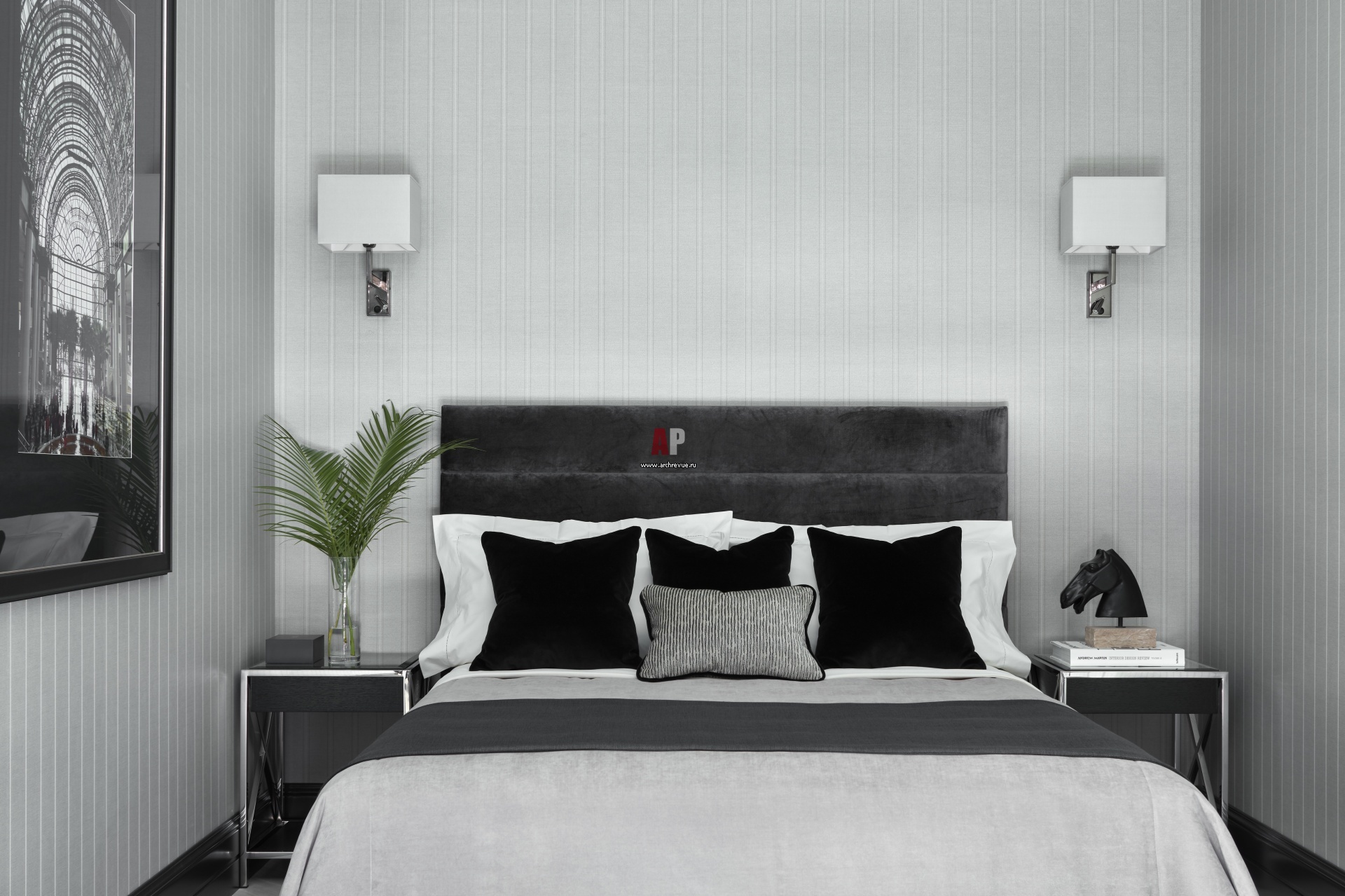 Интерьер гостевой комнаты выдержан в черно-белых тонах. Обои, Andrew Martin. Кровать, на заказ, по эскизу дизайнера. Прикроватные тумбочки, кресла, столик и консоль, Eichholtz.