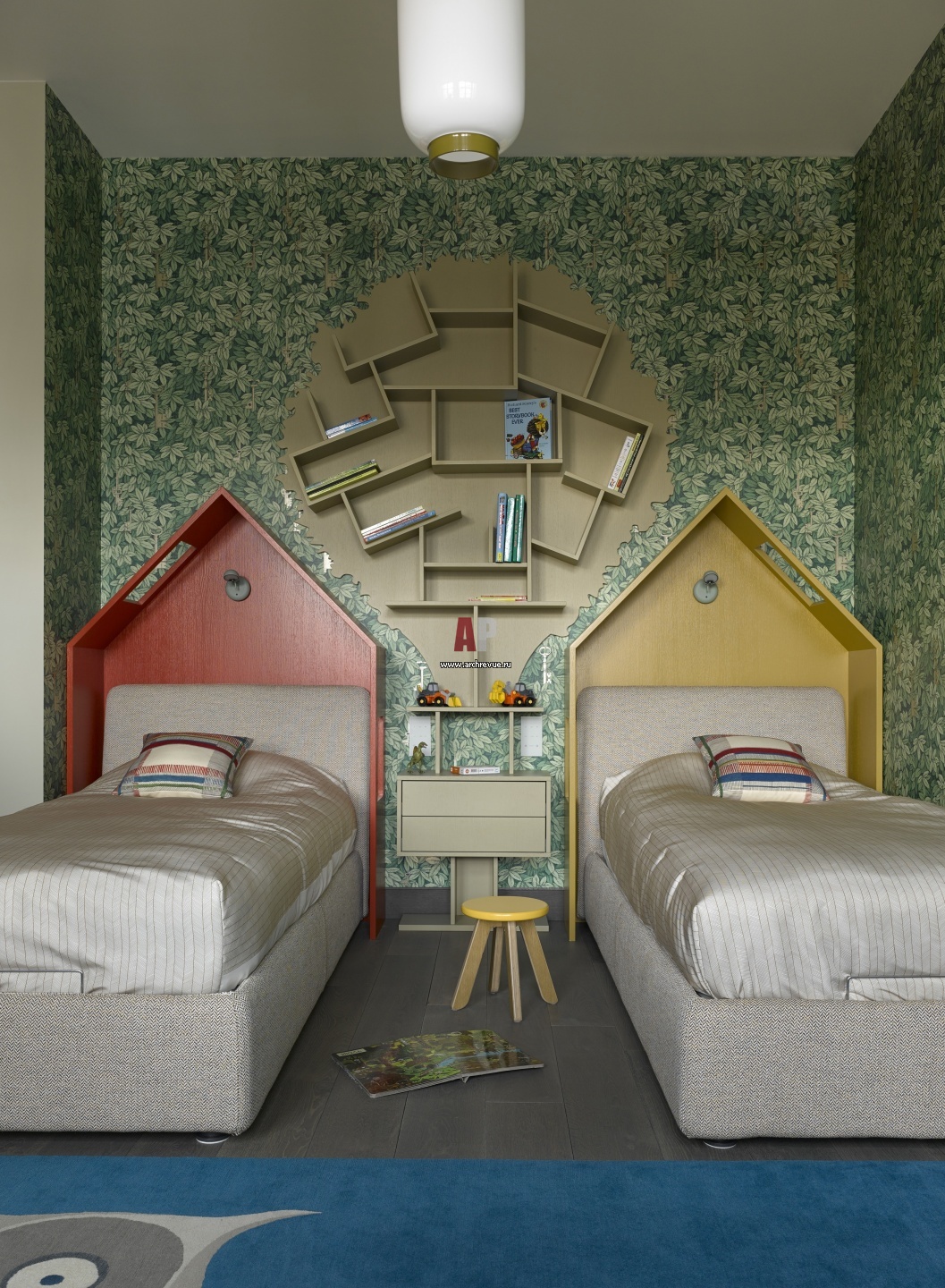 Интерьер детской комнаты. Обои с зелеными листьями, Cole & Son. Между кроватями Вonaldo сделаны шкафы в виде домиков на дереве. Изготовление, «Ассоциация русских мастеров».