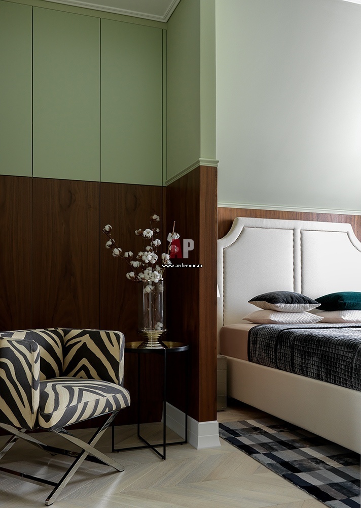 Гостевая спальня в фисташковых тонах выполнена с элементами стиля ретро. Низ стены зашит панелями из ореха. Кресло, Eichholtz.
