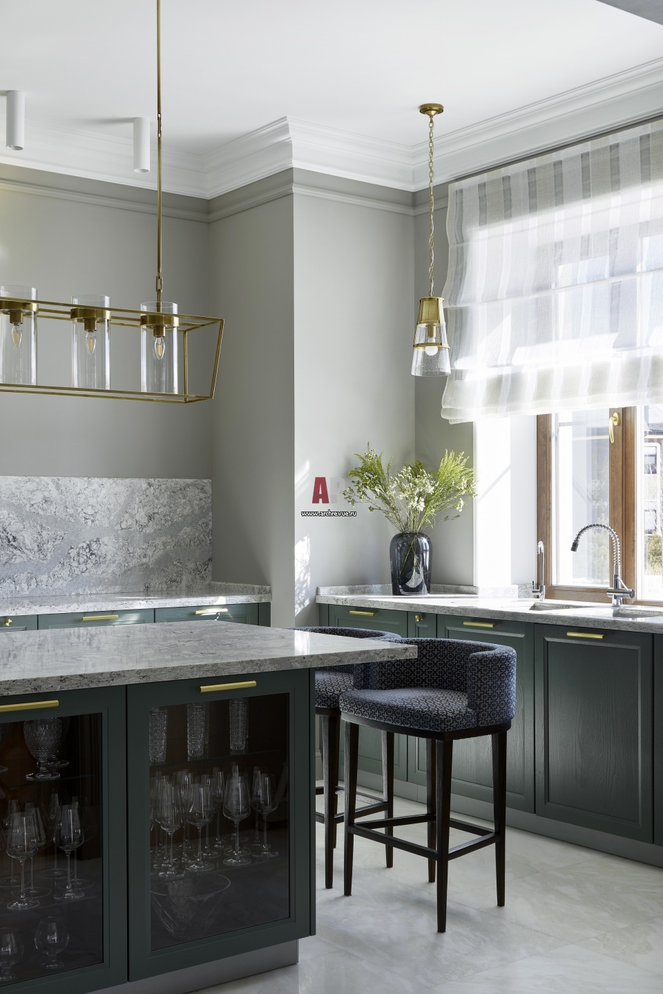 Интерьер кухни. Кухонный гарнитур Leicht выполнен в нестандартном цвете в индивидуальном порядке. Столешница сделана из кварцевого агломерата Cambria.
