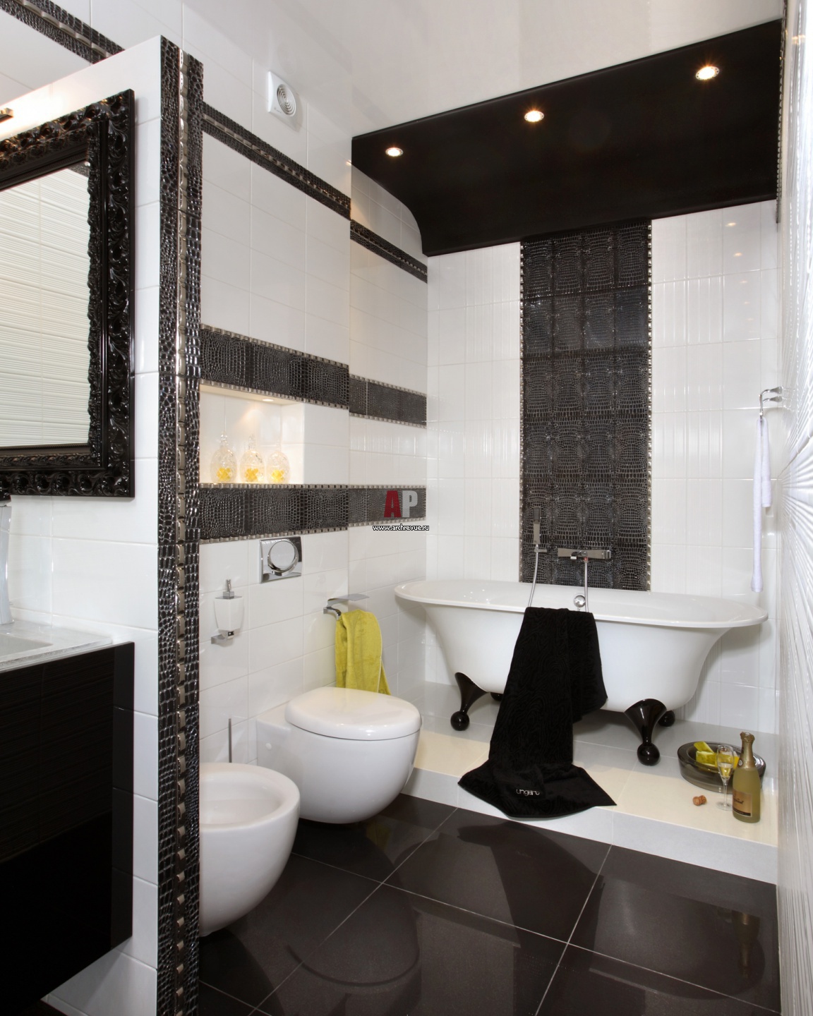 Хозяйская ванная на контрасте черного и белого цветов. Акцентная черная плитка имеет фактуру, имитирующую кожу крокодила. Ножки ванны выкрашены в черный цвет.