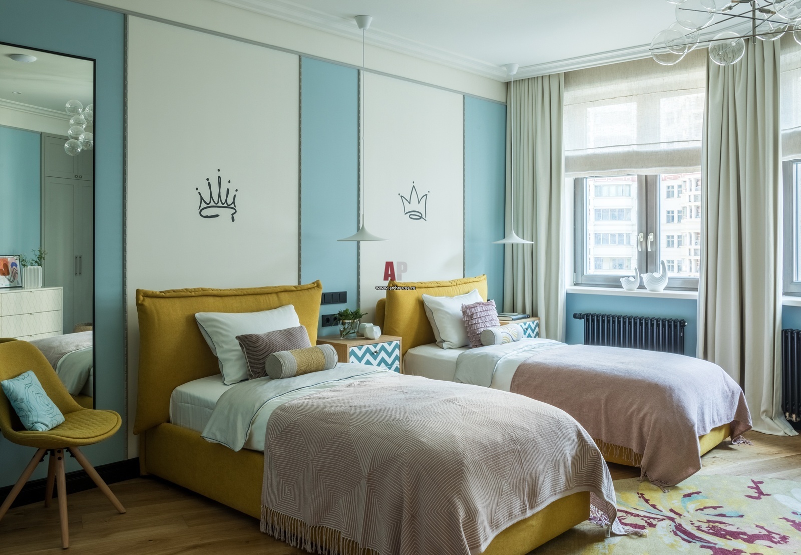 Детская в нежной голубой палитре. Паркет, Finex. Краска, Little Greene. Кровати обтянуты текстилем табачно-желтого цвета.