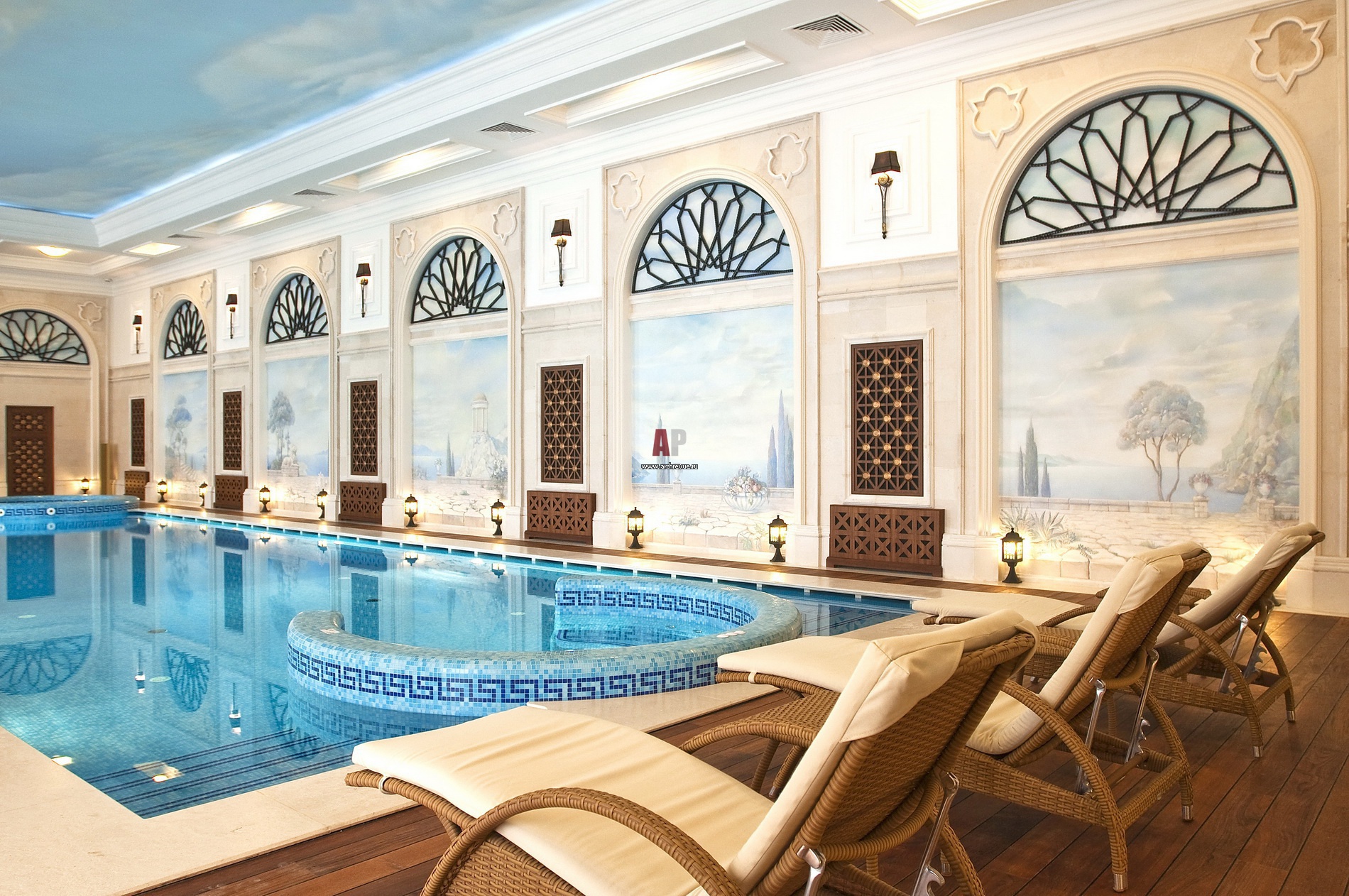 На полу вокруг чаши бассейна – тиковая доска Horning, поставщик Scanwood. Деревянные панели покрыты специальным водоотталкивающим составом, между панелями проложен гидрофобный герметик.