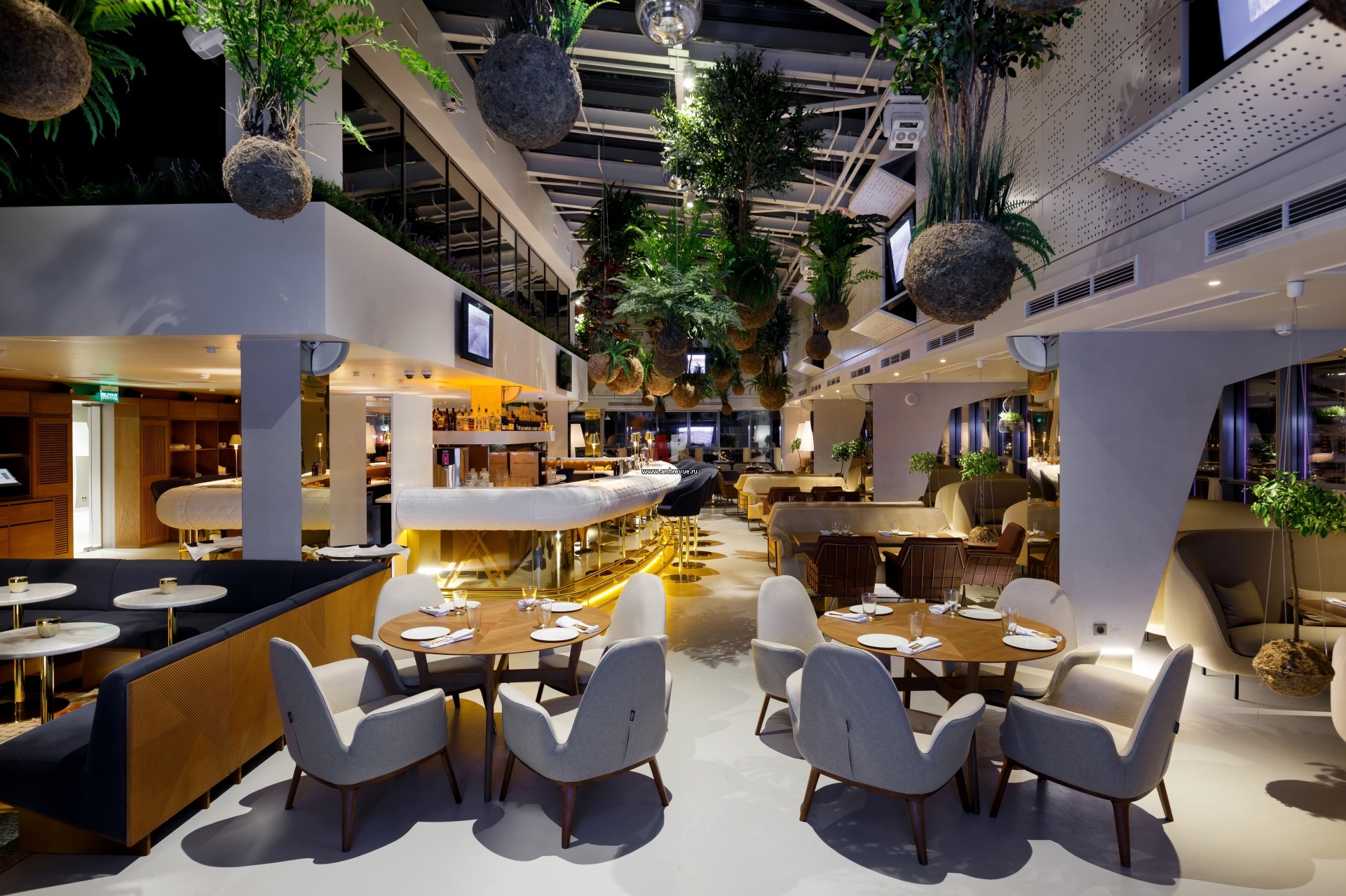 Интерьер зала ресторана «Этаж 41» при вечернем освещении.