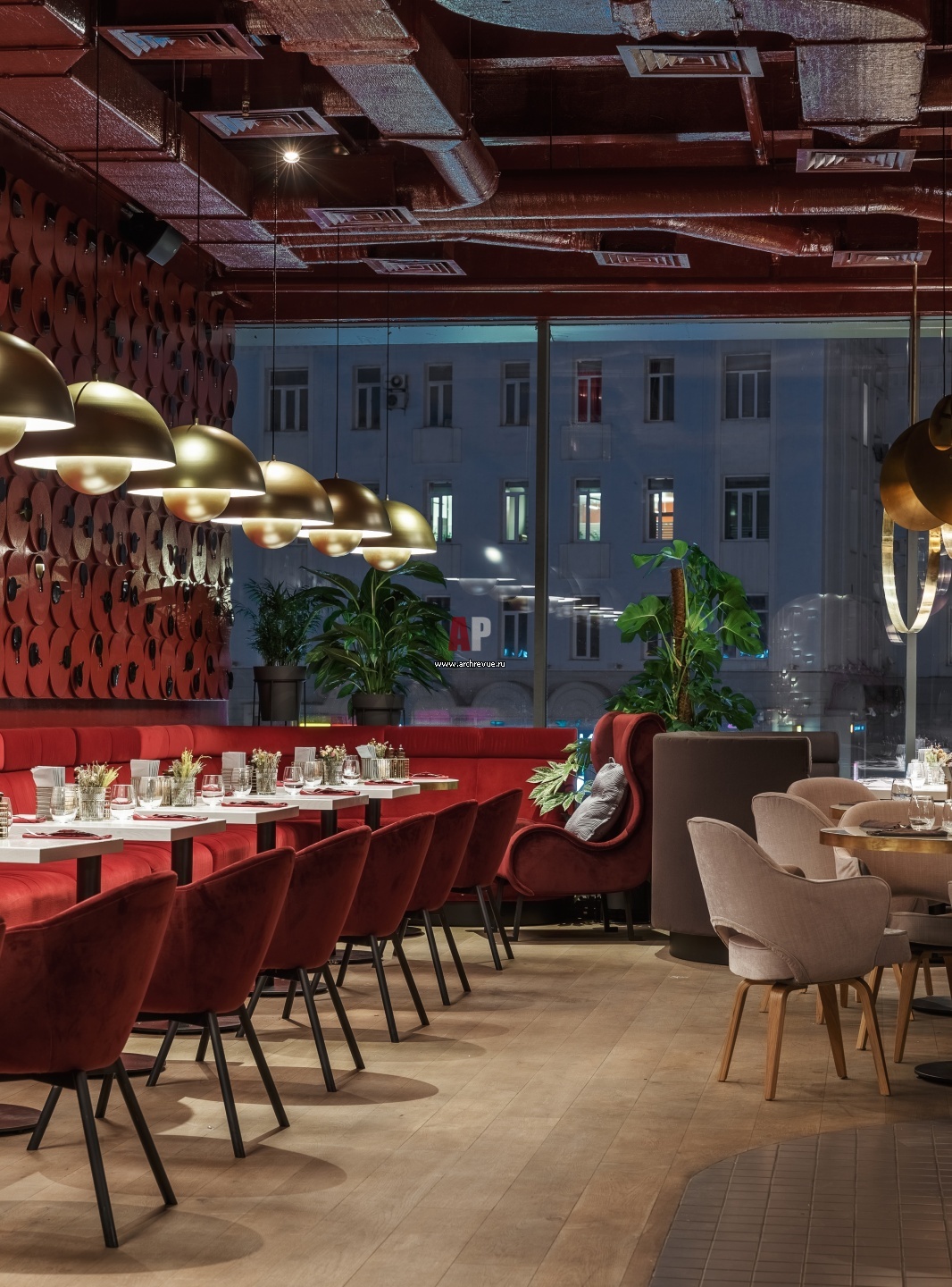 «Пирог мясника» располагается на втором этаже в здании на Новом Арбате, панорамные окна дают много естественного света и открывают эффектный интерьер ресторана на город.