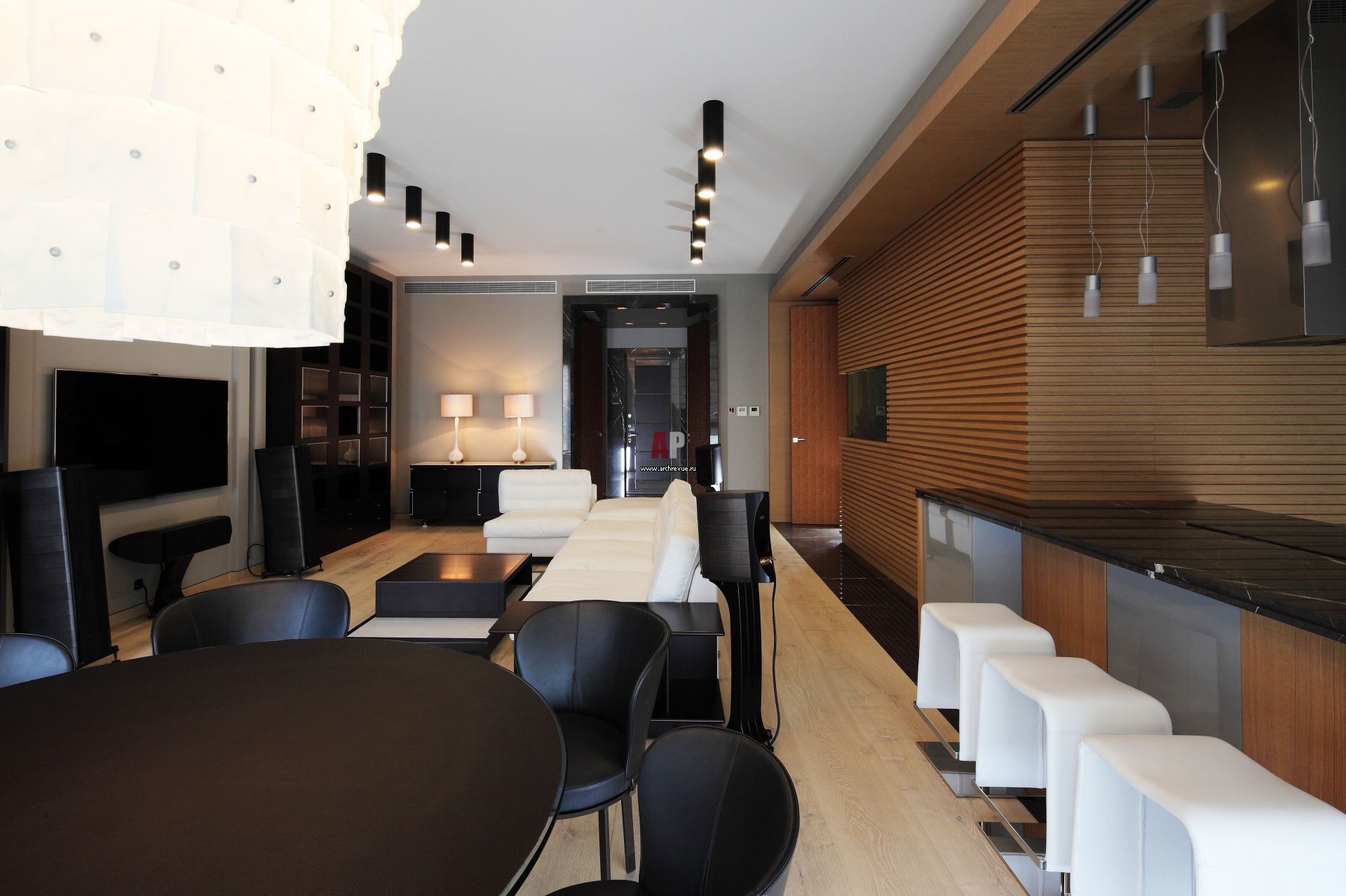 Архитектурная доминанта пространства – деревянный объем, разделяющий комнаты. Он выполнен из дубовых брусков, уложенных ровными рядами. В эту конструкцию интегрированы мини-кухня и большой аквариум. Работы по дереву, «АФ Ника».