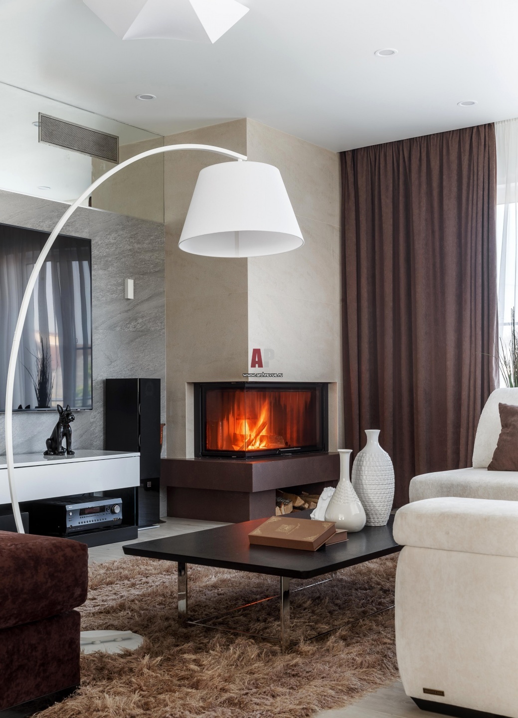 Каминная зона в гостиной. Стена за ТВ и дымоход современного камина облицованы керамогранитом, Atlas Concorde и Levantina. Торшер, Kare Design, модель Arco White.c