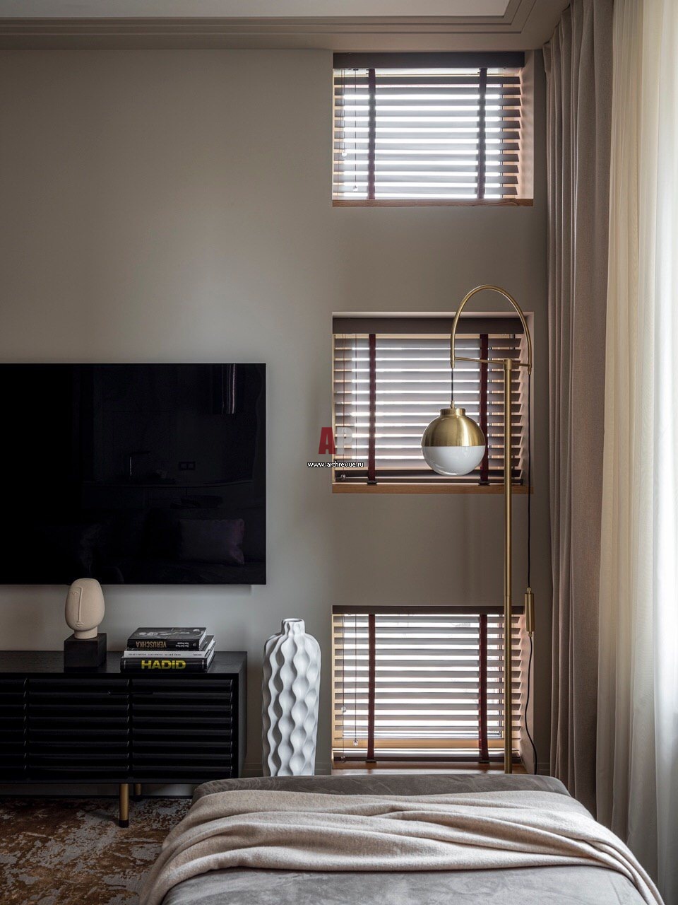 Маленькие фасадные окна обыграны как полки для хранения. Вместе с деревянными жалюзи они придают квартире сходство с традиционным восточным интерьером.