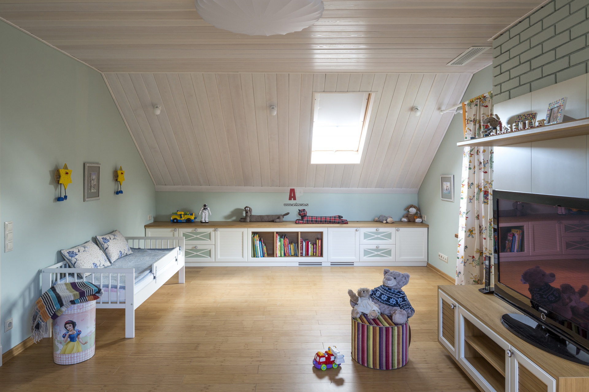 В мансарде организована детская комната со спальней, просторной игровой зоной и местом для занятий внуков. Мансардные окна, VELUX.