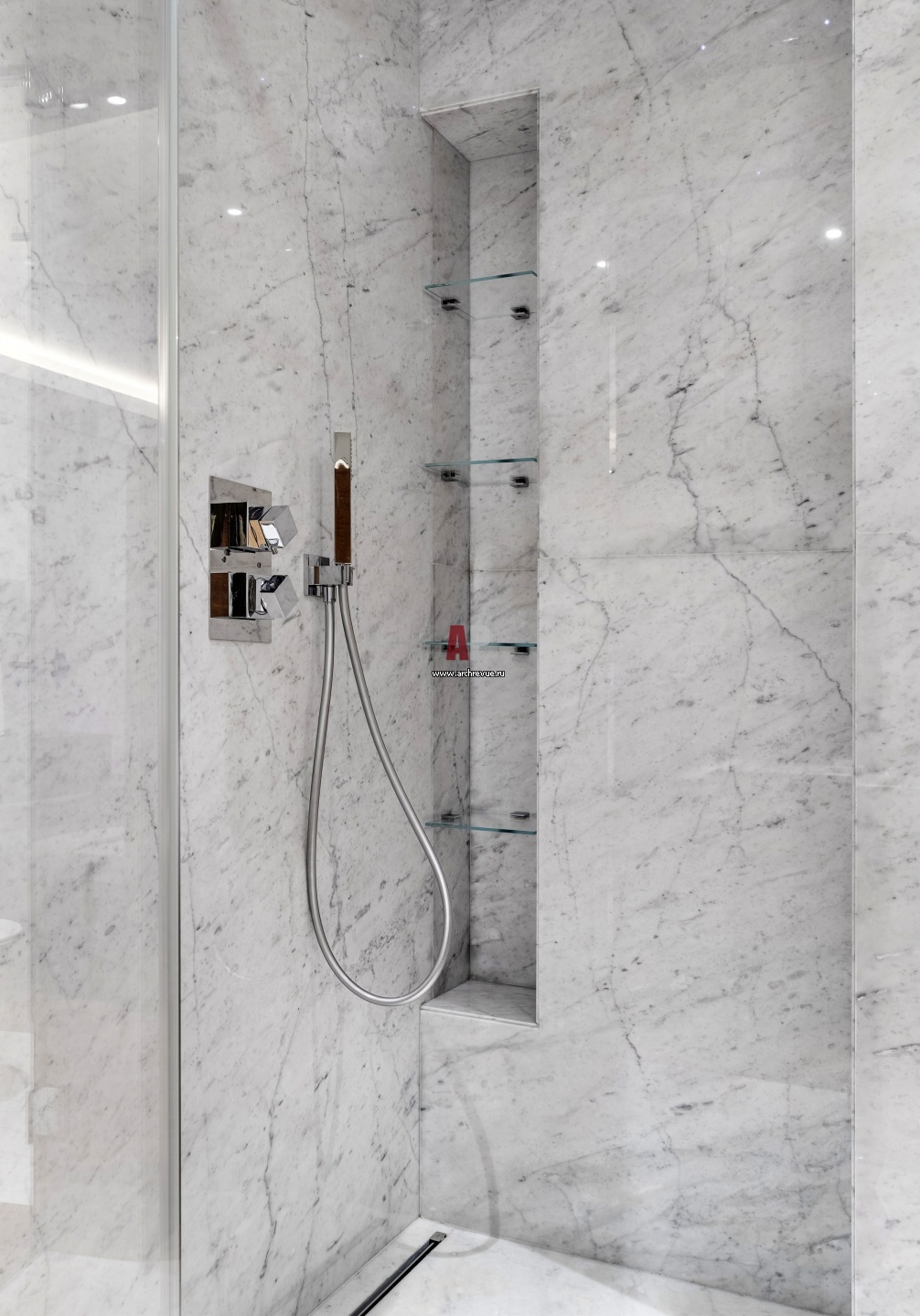 Хозяйская ванная комната. Душевая облицована светлым мрамором с серыми прожилками. Душевой смеситель, Nobili.
