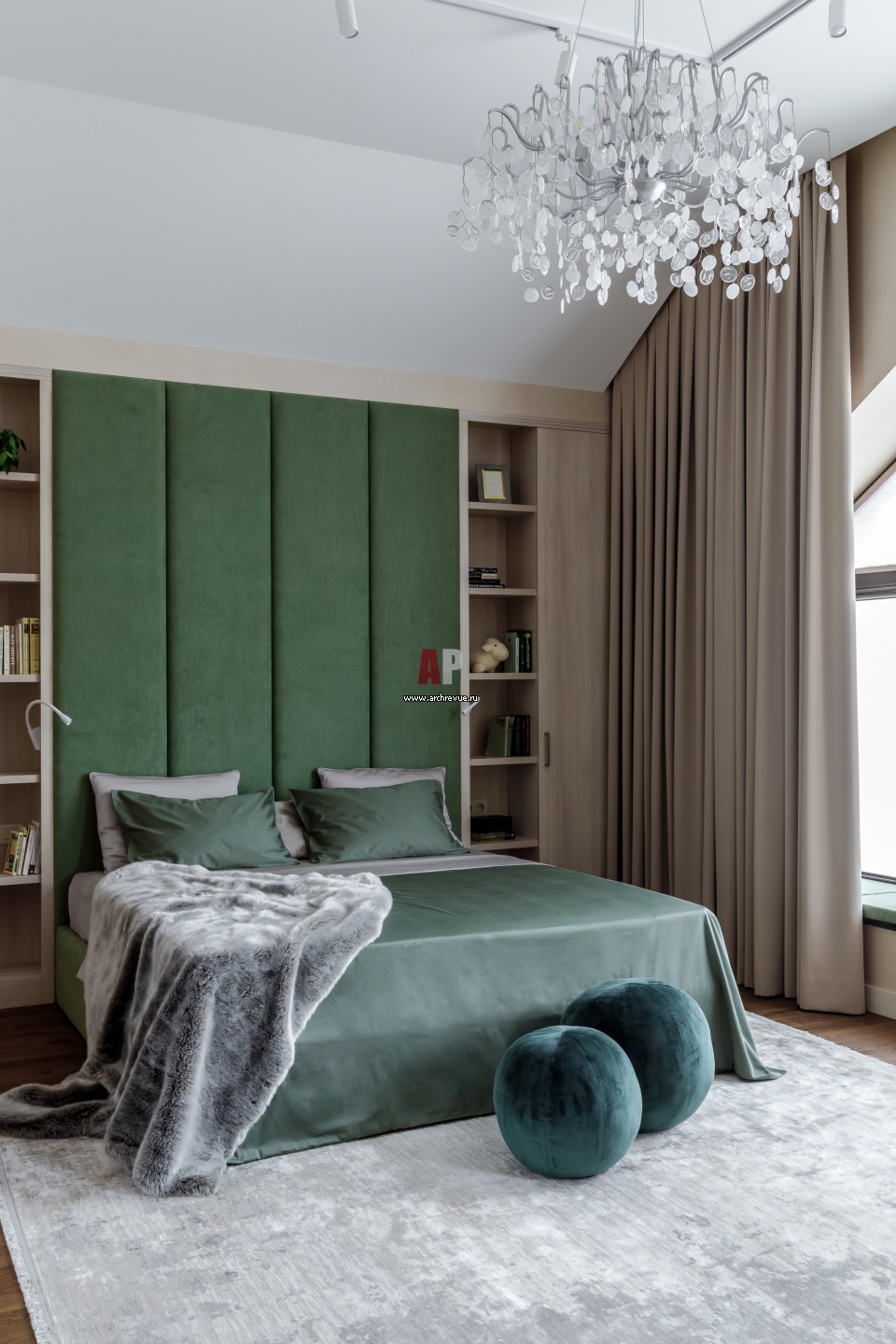 Современный двухэтажный дом с элементами стиля шале. Детская на втором этаже. Вертикальные стеновые панели из зеленого бархата зрительно увеличивают высоту мансардного помещения.