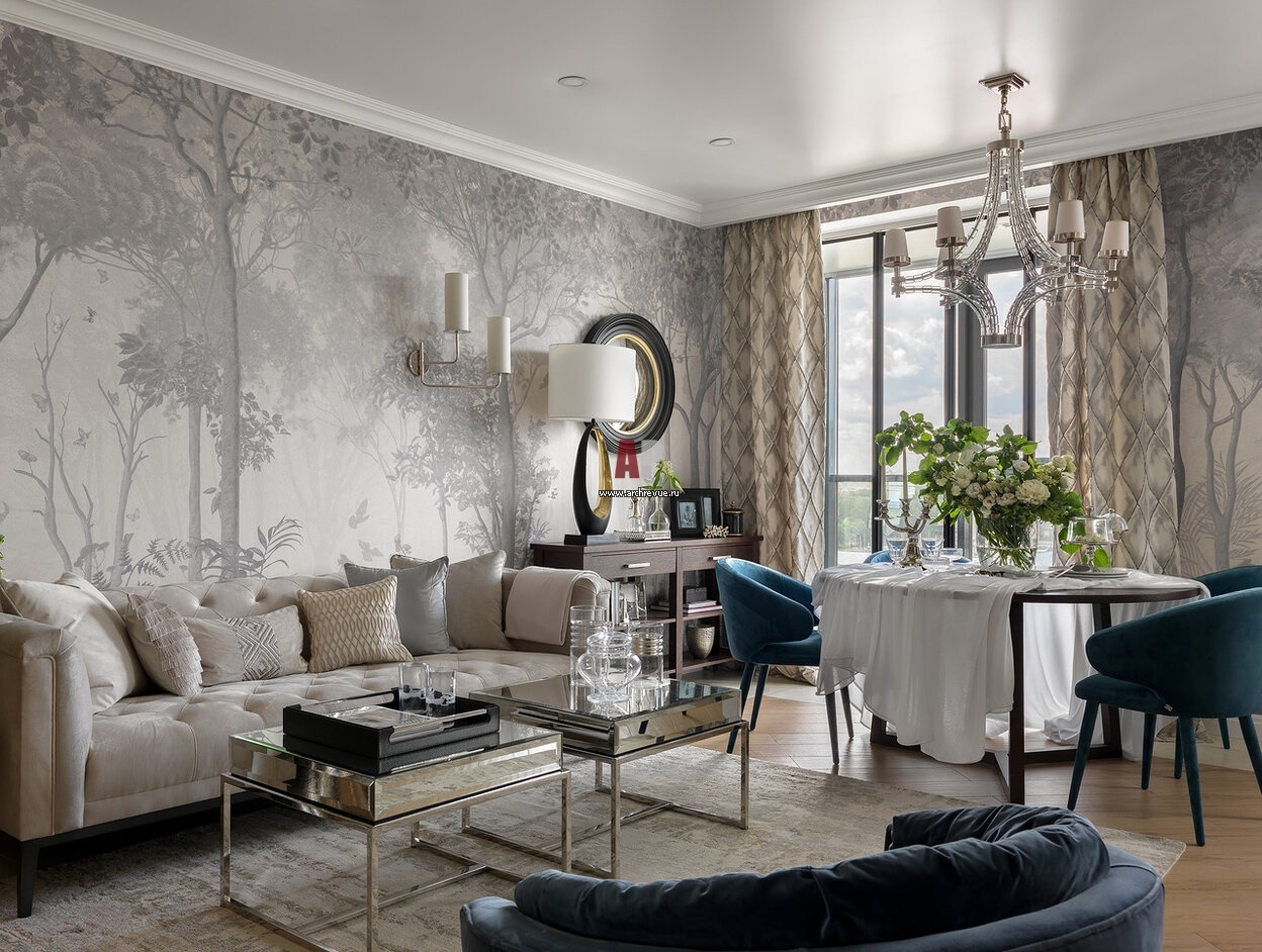 Интерьер неоклассической гостиной выполнен в серых тонах. Зона отдыха оформлена бесшовной фреской с сюжетом Morning in the forest и велюровым финишем. Диван, кресло, стулья обеденные, Eichholtz. Консоль, обеденный стол, на заказ. Люстра, бра, Visual Comfort & Co.