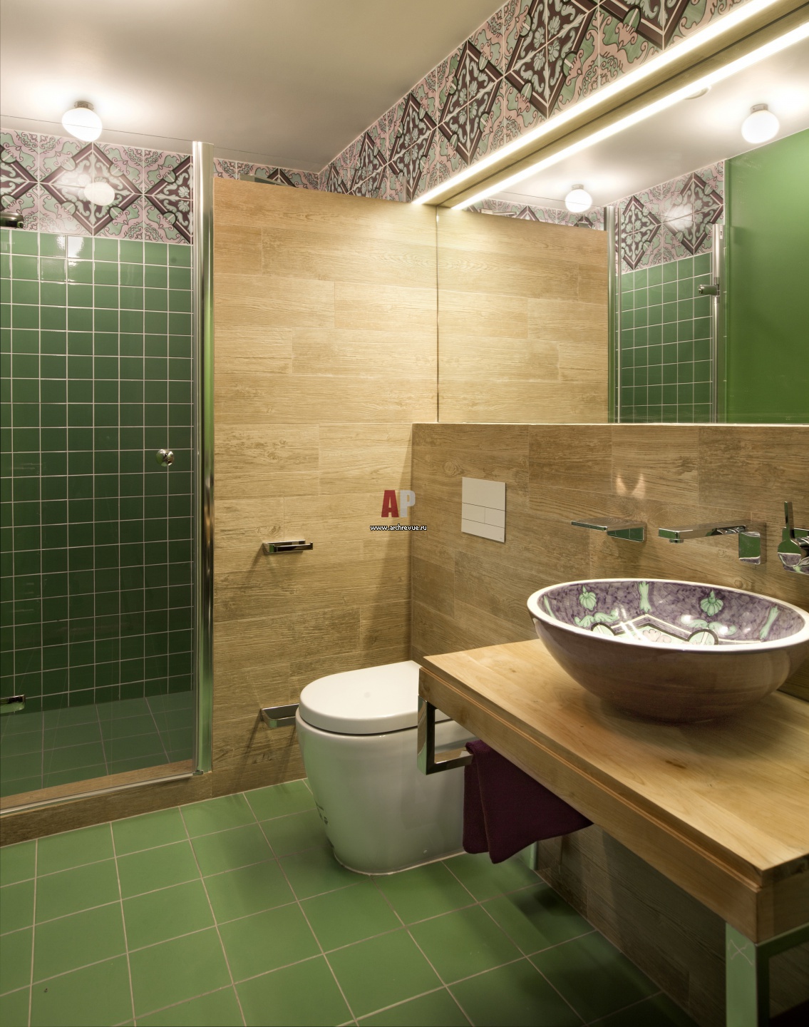 Фото интерьера зеленого санузла. Карниз из глазурованной плитки с восточным орнаментом.