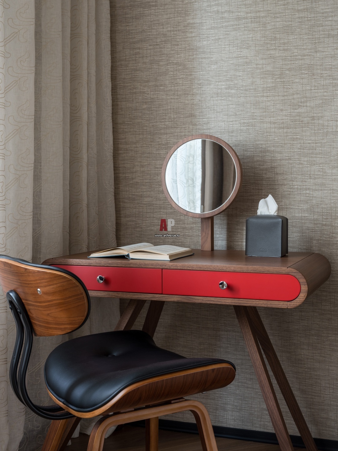 Квартира для временного проживания в мегаполисе. Интерьер спальни. Столик, Steuart Padwick. Стул, Dutchbone.
