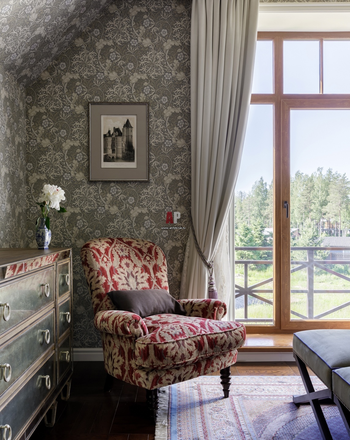 Спальня оформлена в английском классическом стиле. Комод и кресло, Fabian Smith. Обои с активным флористическом орнаментом, Morris & Co.