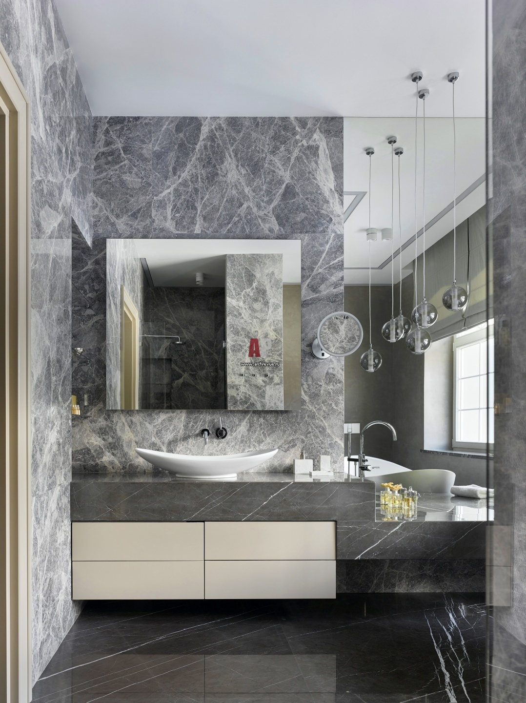 Ванная комната при главной спальне. На стенах и полу – серый мрамор. Сантехника, Villeroy & Boch.