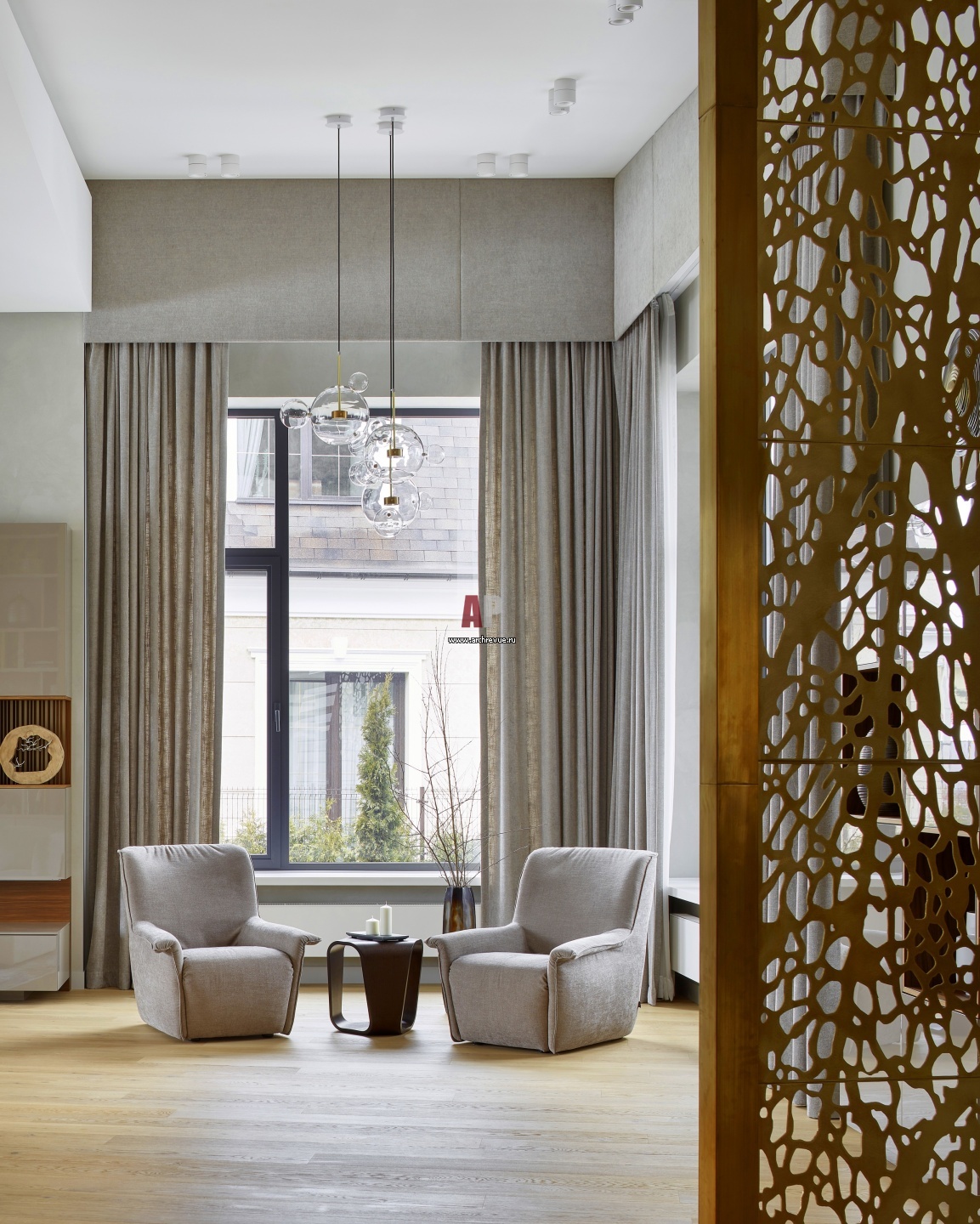Украшение дома – латунные перегородки с рисунком в виде листьев. Они сделаны на заказ по эскизам дизайнеров. Кресла, Pianca, модель Dialogo. Журнальный стол, Busnelli, модель Infinity.