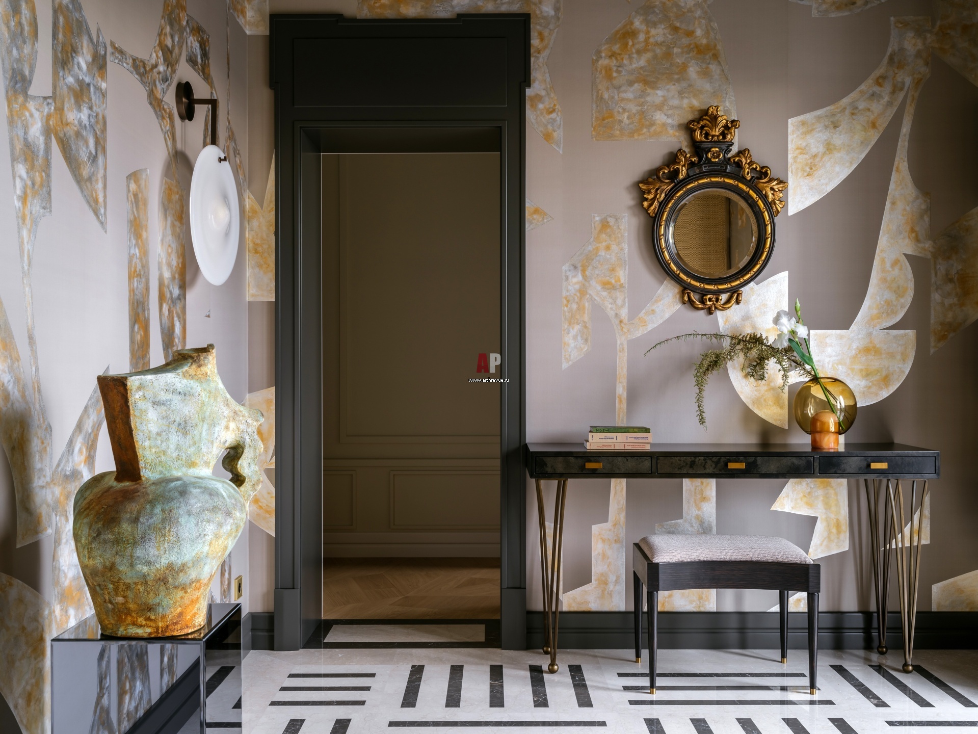 Дом распложен на участке так, что максимум прямых солнечных лучей приходится на входную зону, тогда как гостиная получает меньше света. Чтобы компенсировать этот недостаток, дизайнер использовал интересный декоративный прием: затемнил входную группу, создал в ней ощущение камерности, а общую зону, напротив, сделал максимально светлой. Такой контраст создает ощущение воздуха, буквально распахивает объем гостиной и связанных с ней столовой и кухни.