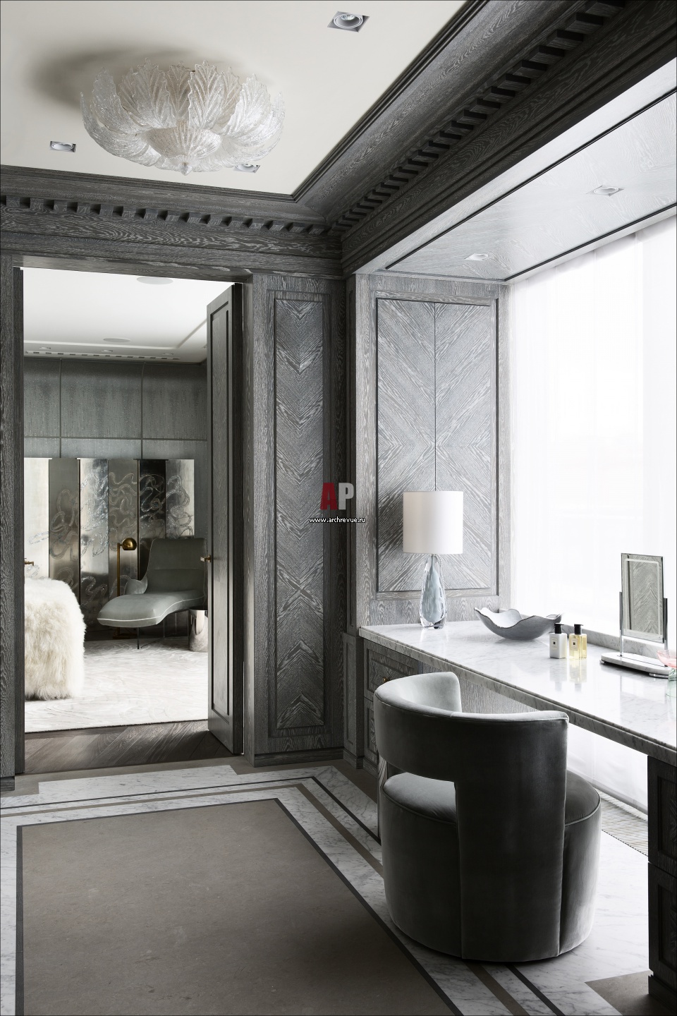 Интерьер ванной с будуаром в отделке из посеребренного дуба. На полу – панно из нескольких сортов серого мрамора. Внутиопльные конвекторы, Moehlenhoff.