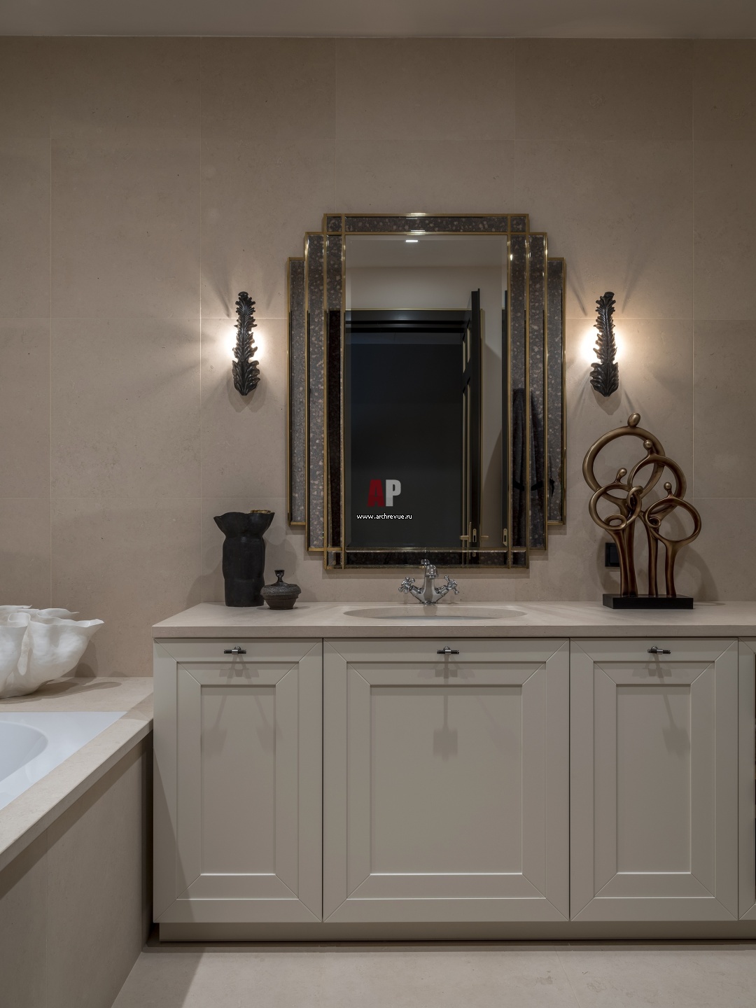 Интерьер хозяйского санузла. На стенах и полу светлый африканский камень, Decormarmi. Умывальник, на заказ; столешница – мрамор.