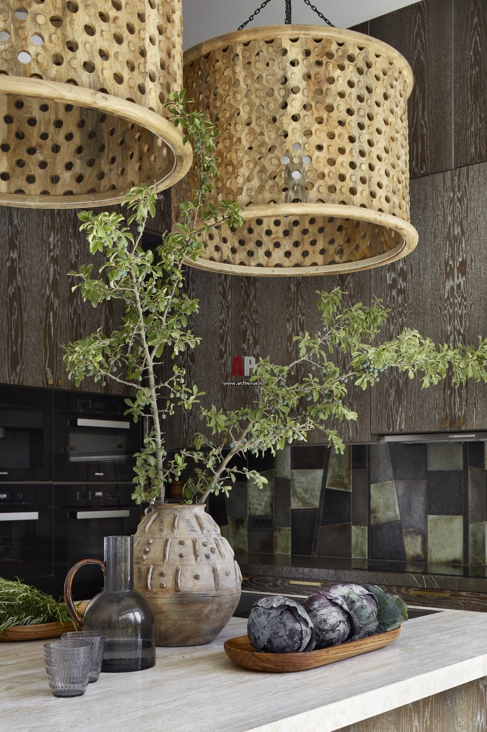 Кухонный фартук – авторская керамика, Crea ceramics; его сложная геометрия напоминает полотна чешских кубистов. Столешница на острове из травертина, лощение.