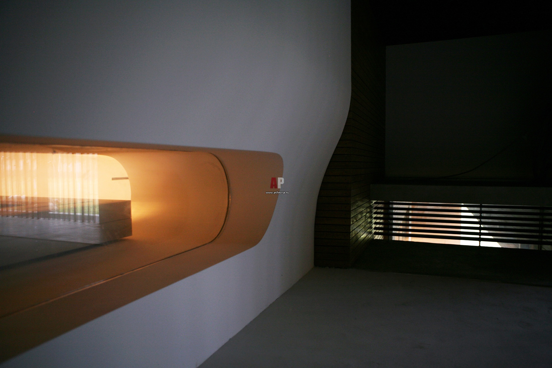 Деталь интерьера дома в стиле минимализм. Горизонтальные оконные проемы находятся ниже уровня глаз.