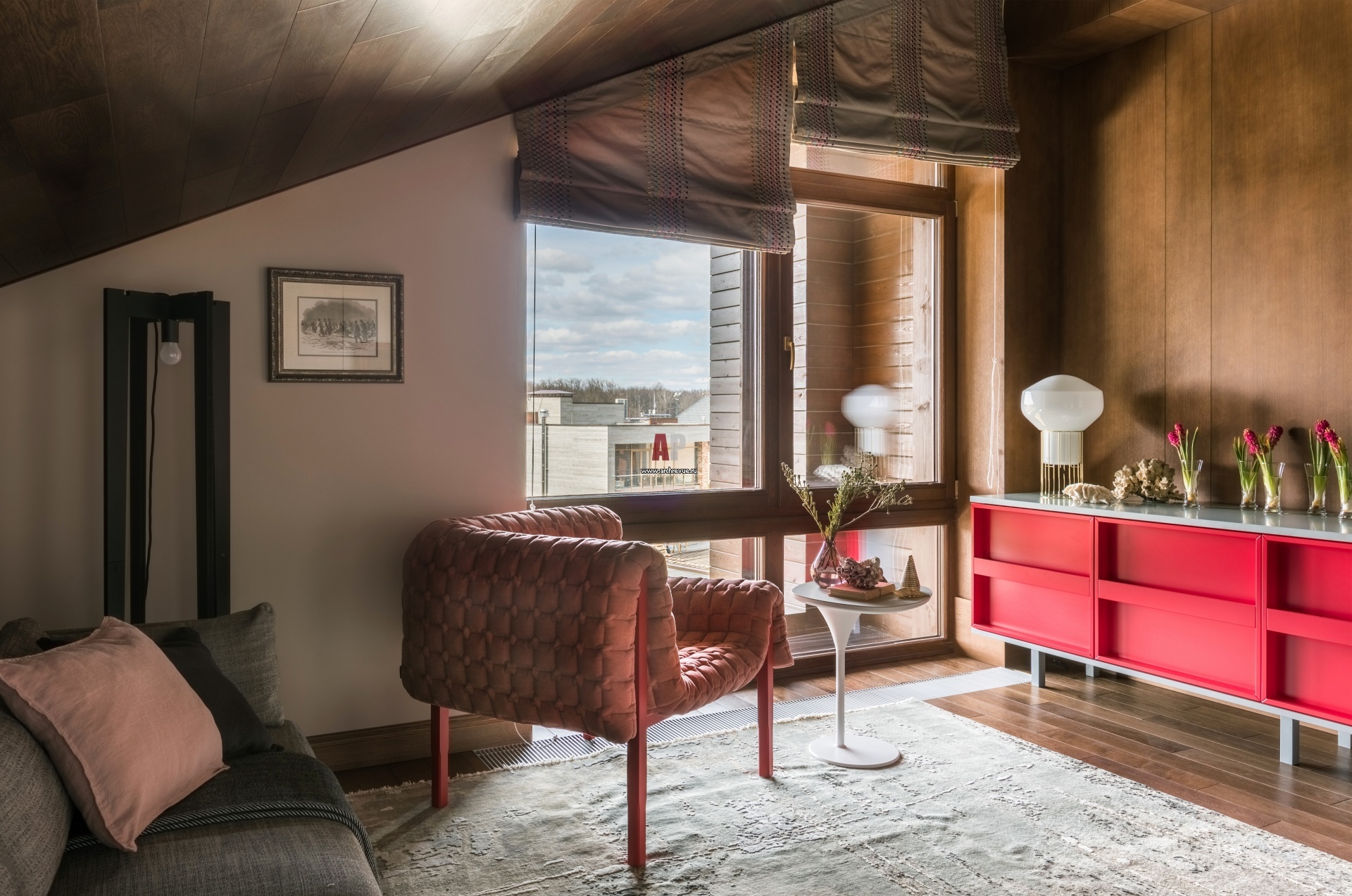 Гостиная в мансарде при гостевой спальне. Диван, Swan. Комод по авторским чертежам. Кресло, Ligne Roset. Столик Moroso. Настольный светильник, Fabbian. Торшер, Wever & Ducré.